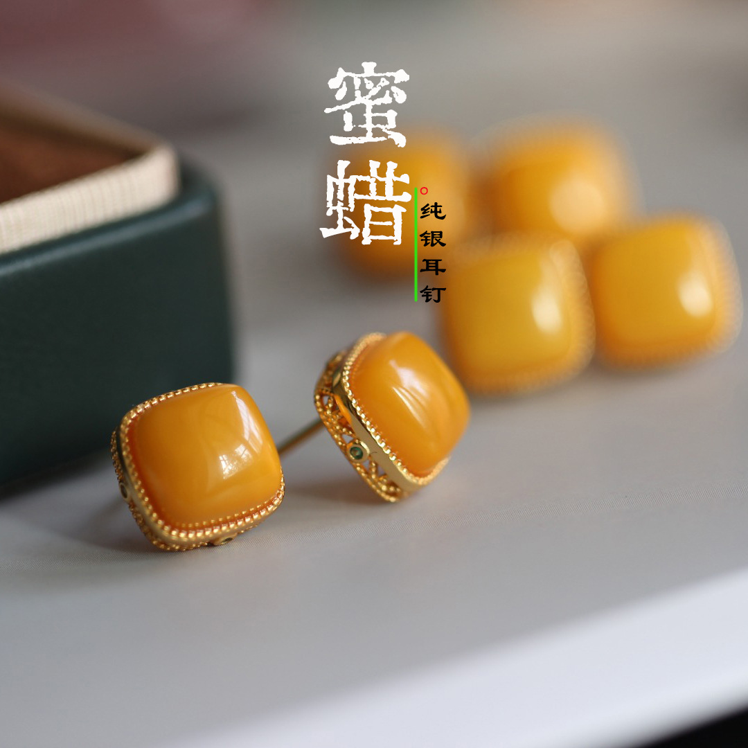 メーカー卸売り天然老蜜ろう耳ボタン925純銀イヤリング高級感耳飾り創意黄色象眼イヤリング