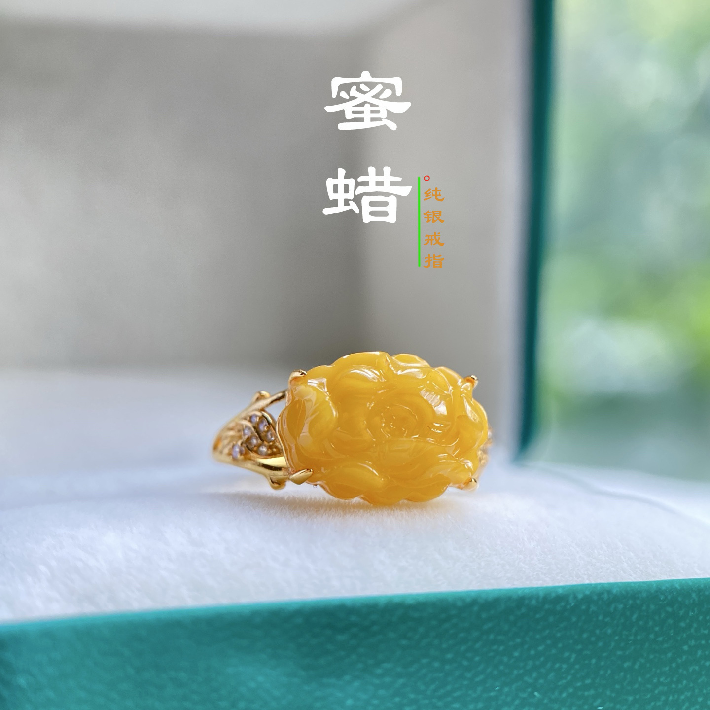 天然满蜜鸡油黄蜜蜡牡丹花戒指S925纯银保真可出鉴定证书现货批发