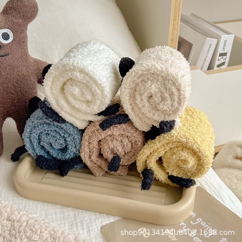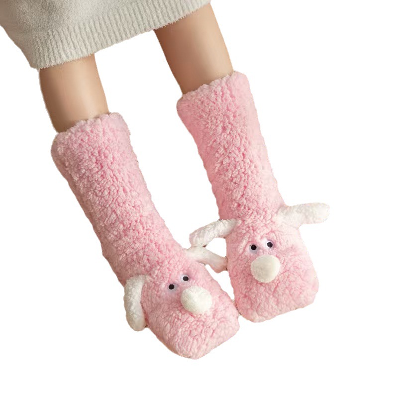 冬季纯色加厚加绒毛绒款卡通可爱小狗款式中筒保暖家居睡眠袜子