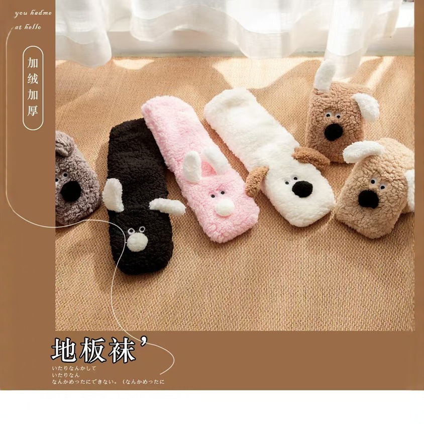 可爱小狗卡通珊瑚绒袜子女冬季加绒保暖居家地板睡眠袜卡通睡眠袜