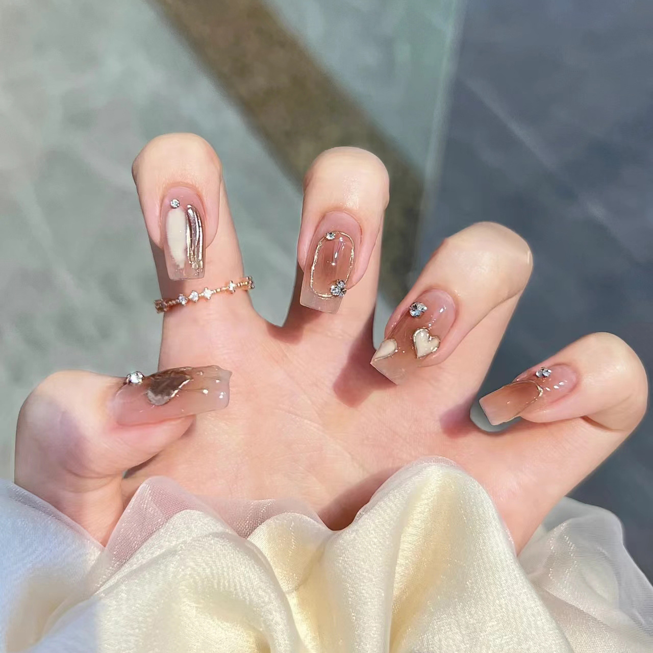 手で甲クリーム愛キャラメルを着て、金琥珀の完成品の爪を染めます。
