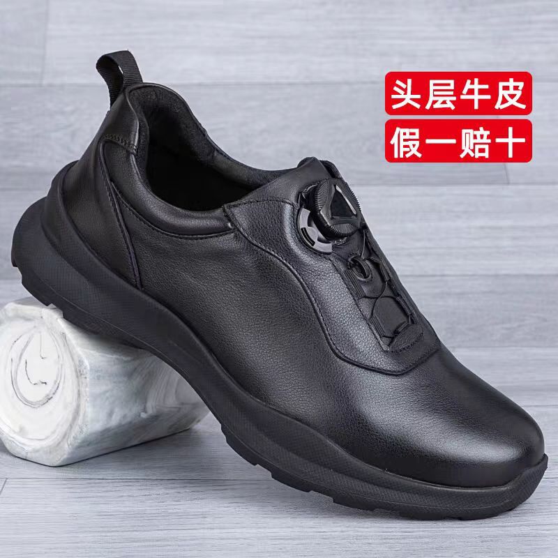 外国貿易向け本革スポーツメンズシューズ、秋モデル、回転ボタン付き、第一層牛革、オールブラック、快適で通気性のあるカジュアルランニングシューズ