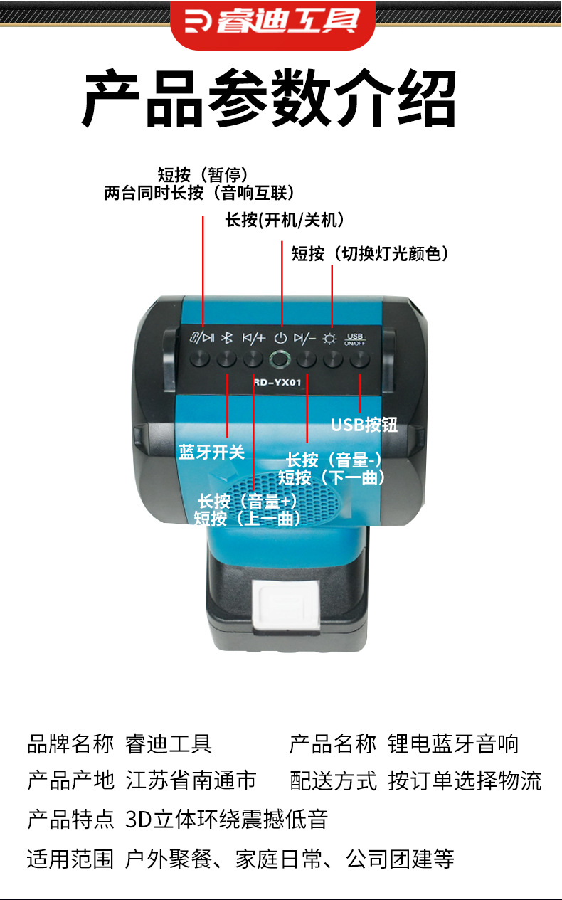 跨境21V蓝牙音箱音响USB蓝牙输入USB/TYPE-C充电得伟牧田美沃奇脚
