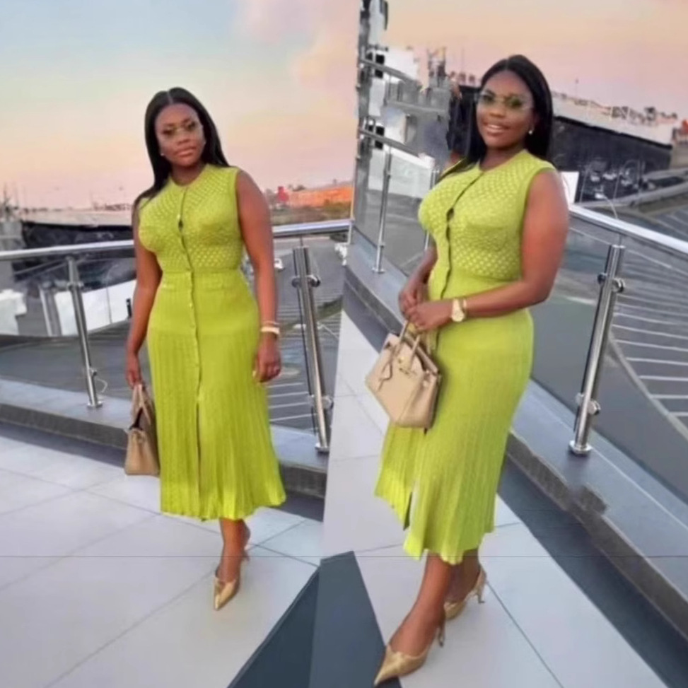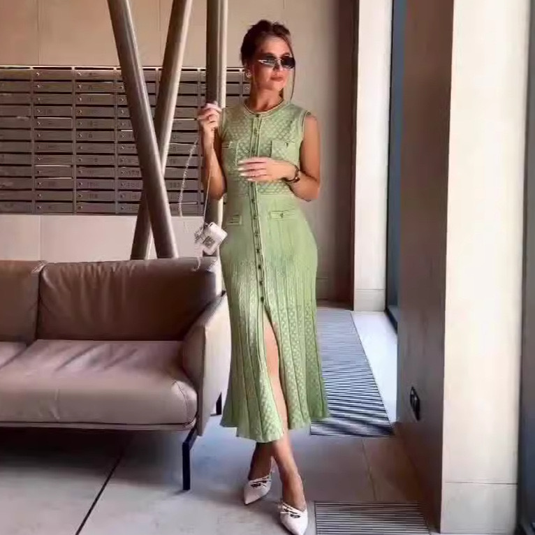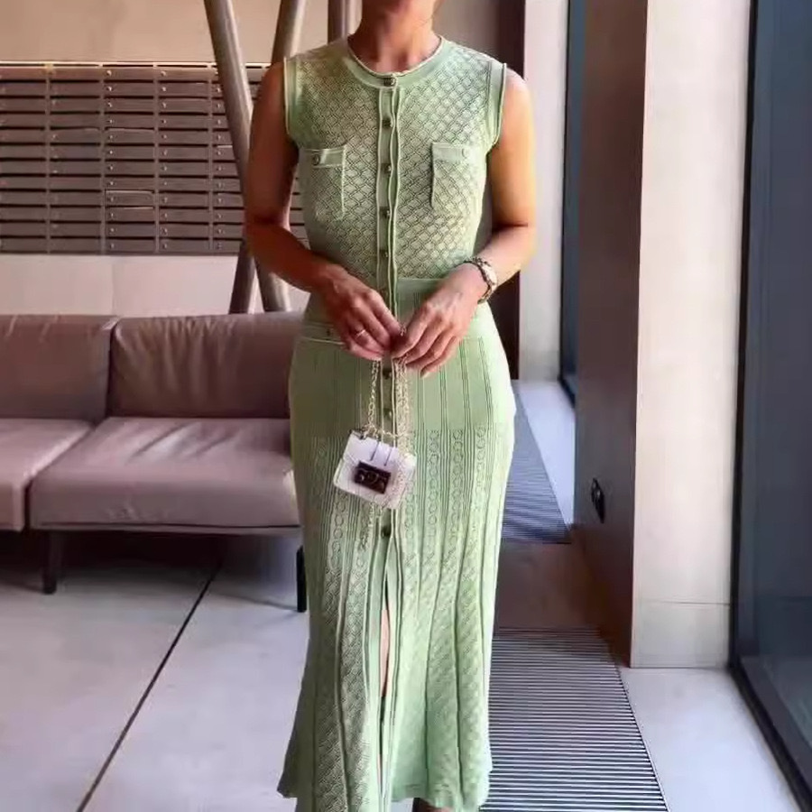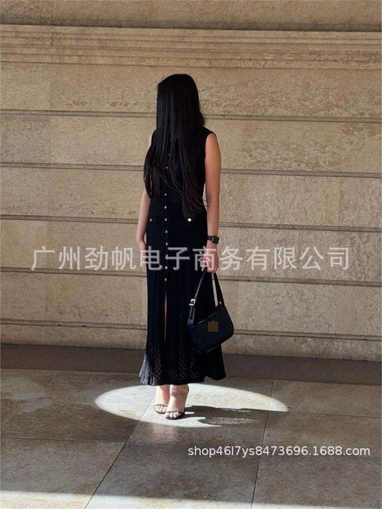 2025 夏クロスボーダーフレンチスタイルの新しいシングルブレストファッショナブルでエレガントなスリムニットドレス女性のロングスカートノースリーブ