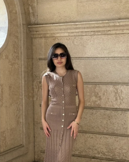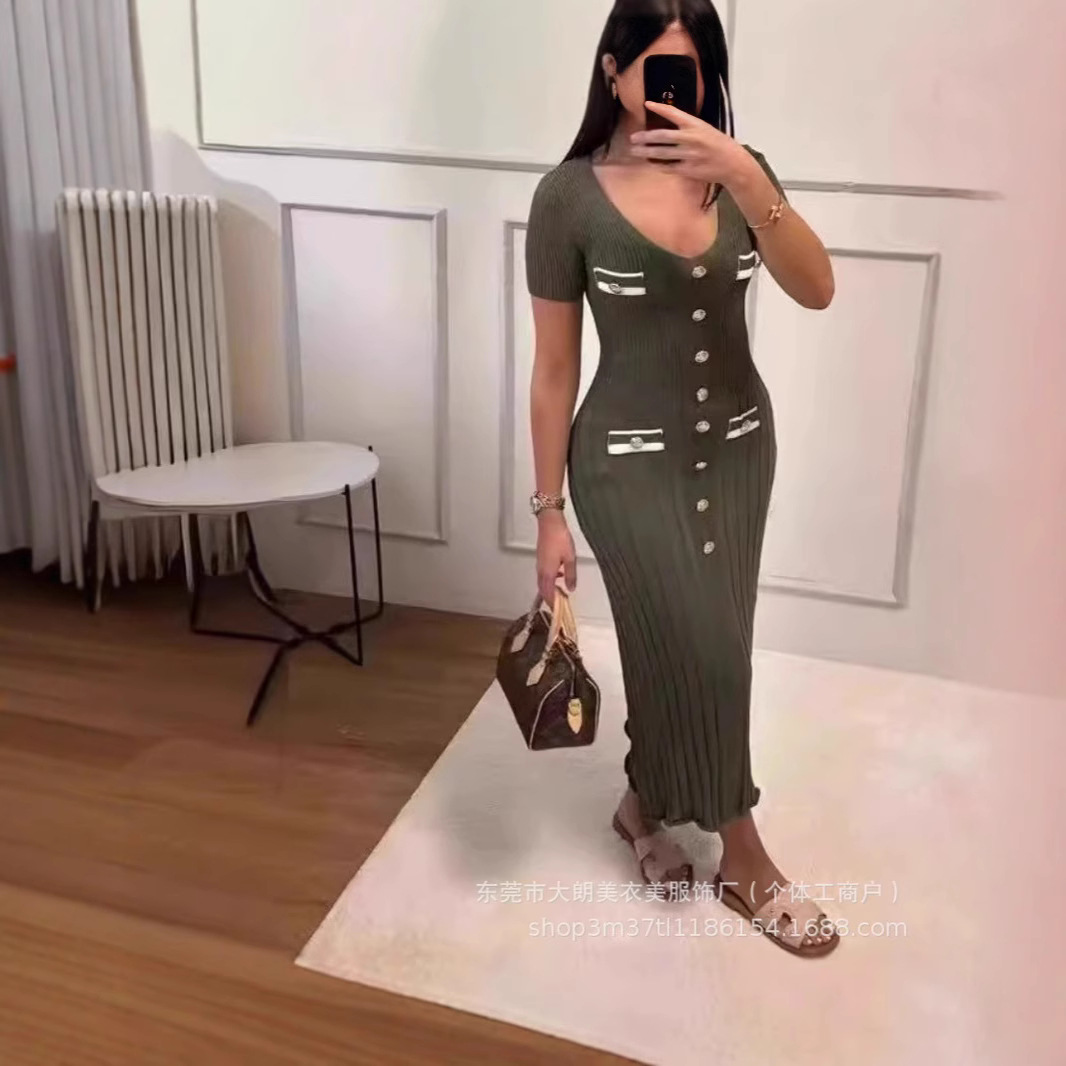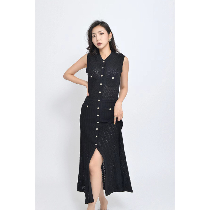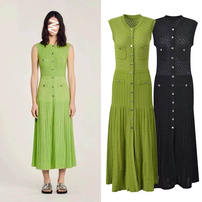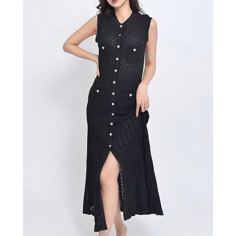 2025 夏クロスボーダーフレンチスタイルの新しいシングルブレストファッショナブルでエレガントなスリムニットドレス女性のロングスカートノースリーブ