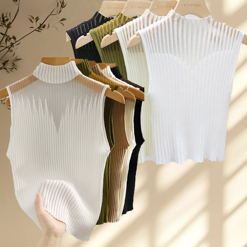 夏用プルオーバーラウンドネックノースリーブニットシャツ、アイスシルクベスト、万能無地ニットTシャツトップス、通気性のある夏用トップス