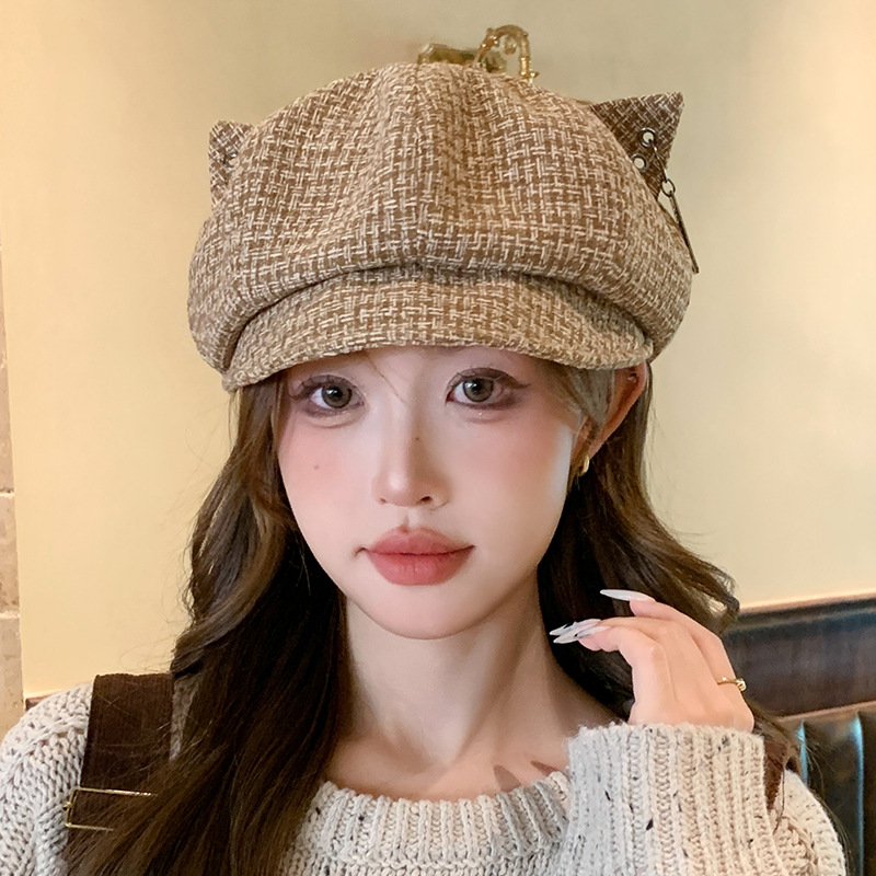 韩系复古百搭格纹贝雷帽秋冬时尚防风保暖八角帽英伦风画家报童帽