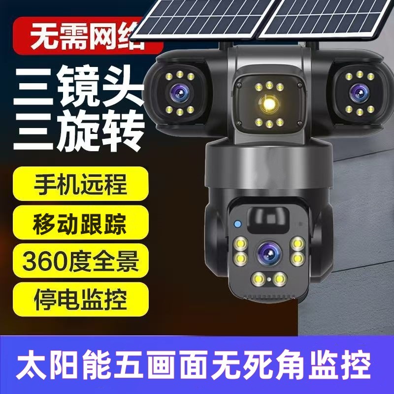 太阳能摄像头三旋转五画面360°全景无线wifi/4g防水家用安防监控