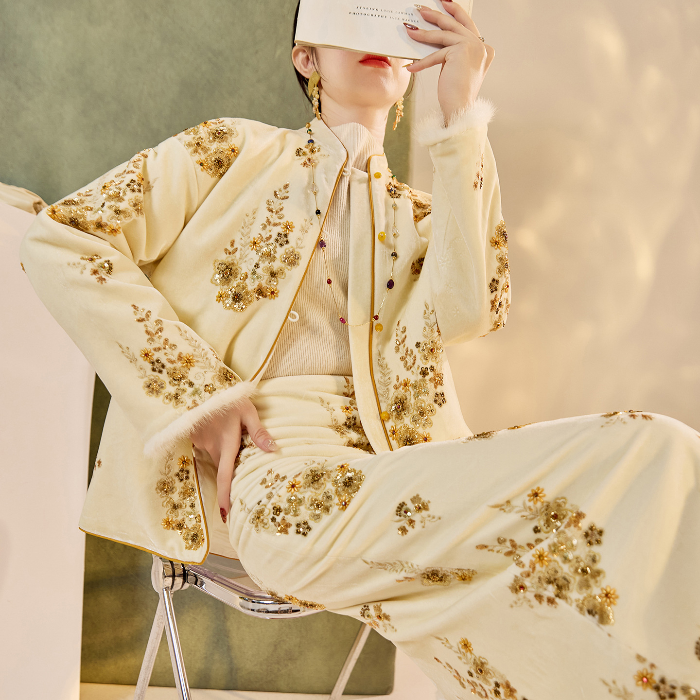 秋冬新款新中式立领国风刺绣加棉水貂毛外套+开叉半裙套装 NX028