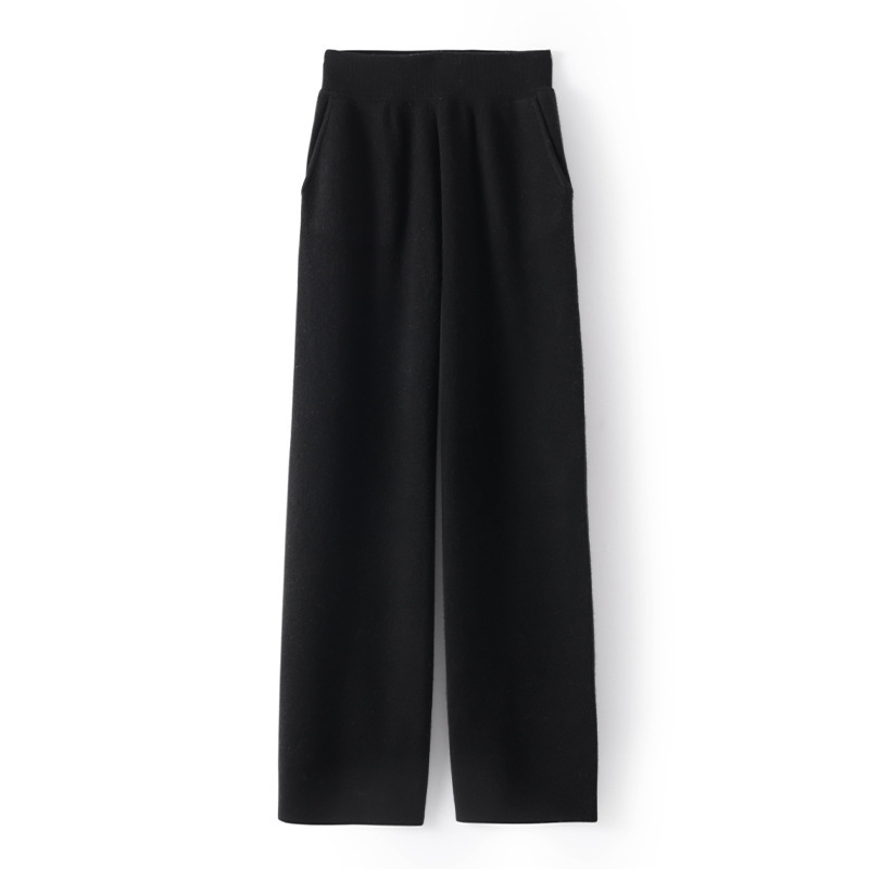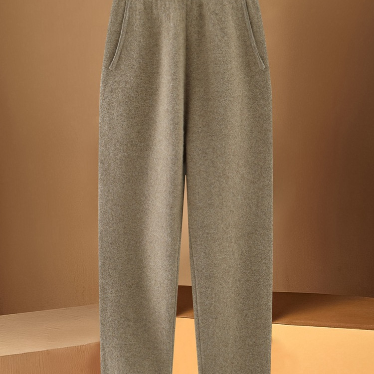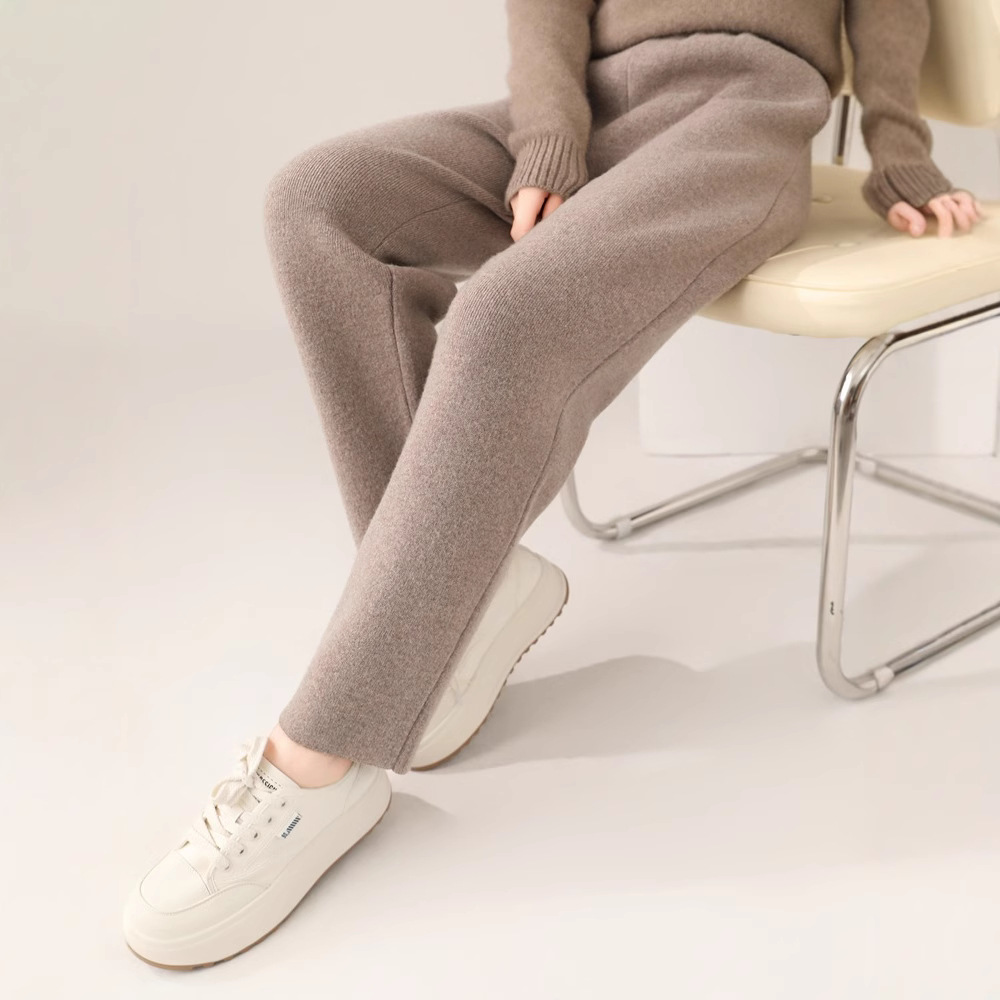 四平加厚纯羊毛裤女侧兜松紧腰居家晨练休闲外穿针织羊毛铅笔毛裤