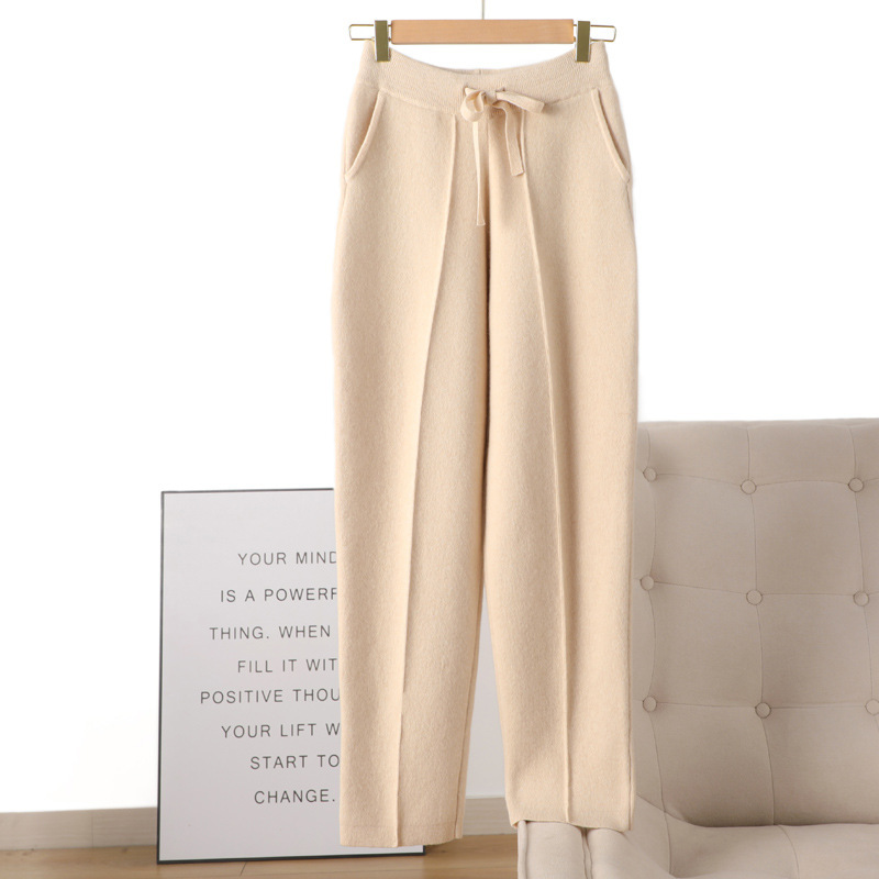 秋冬女性用100%ピュアウールパンツ、ハイウエスト、厚みのあるカールエッジ、カジュアルストレートウールスウェットパンツ、小足用ハーレムパンツ