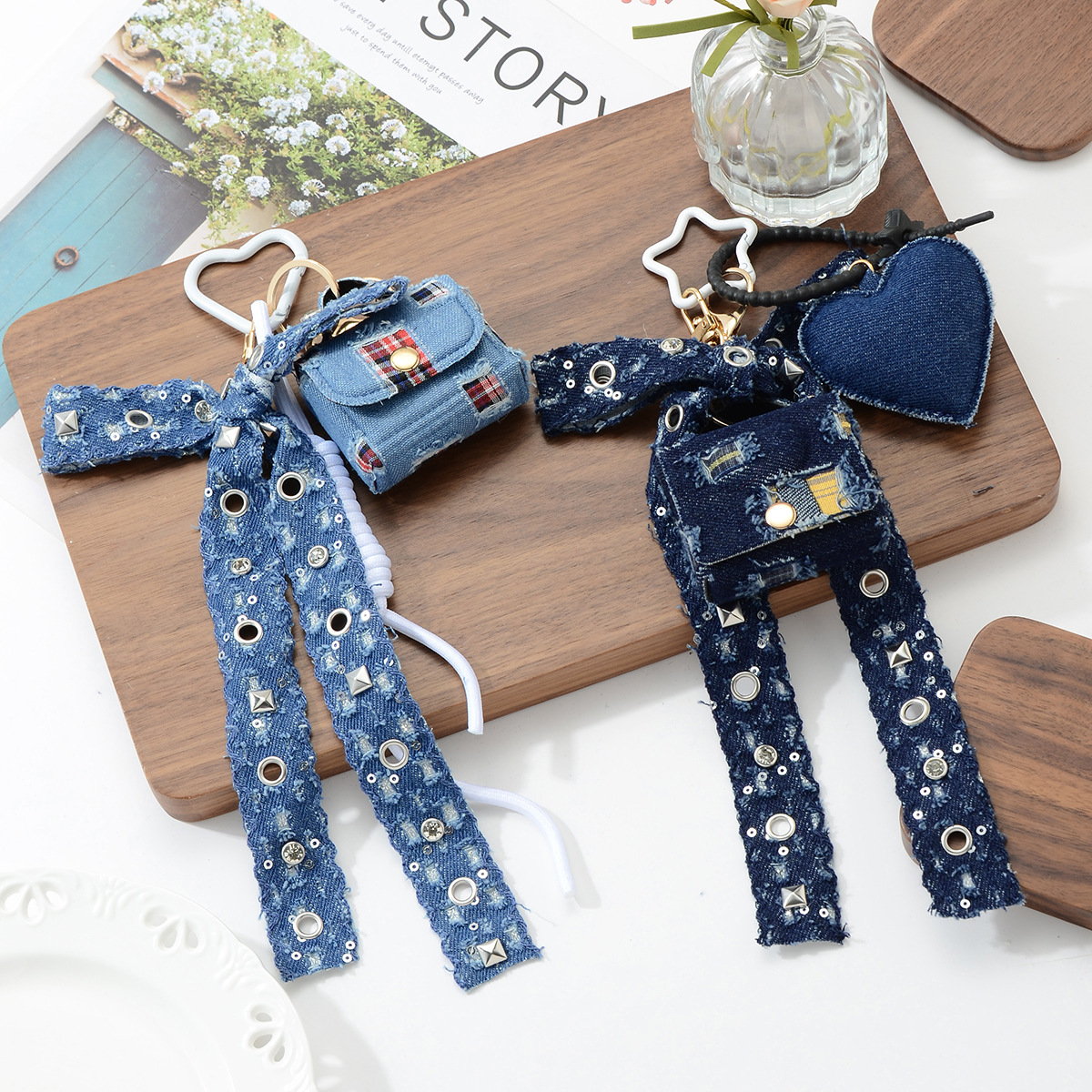 新款y2k废土风复古个性牛仔布爱心铆钉水钻蝴蝶结格纹小包钥匙扣
