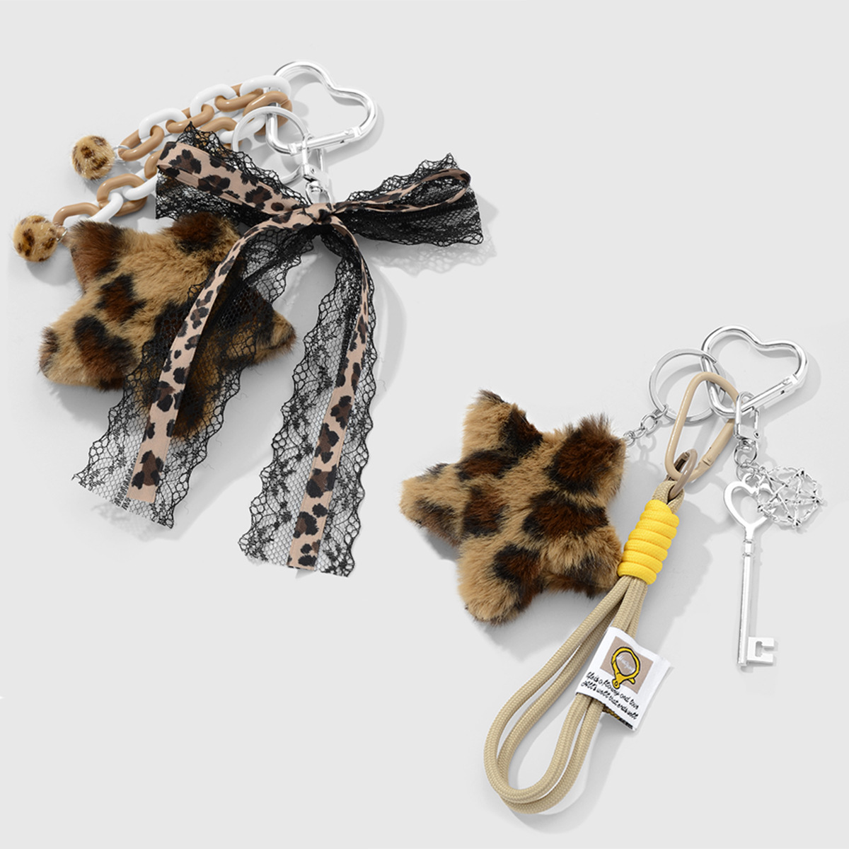 复古时尚甜酷豹纹星星蕾丝蝴蝶结仿貂毛球亚克力链条编织绳钥匙扣