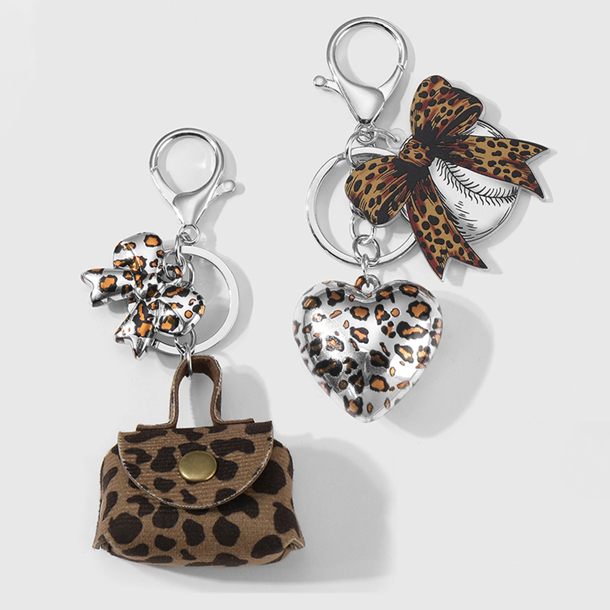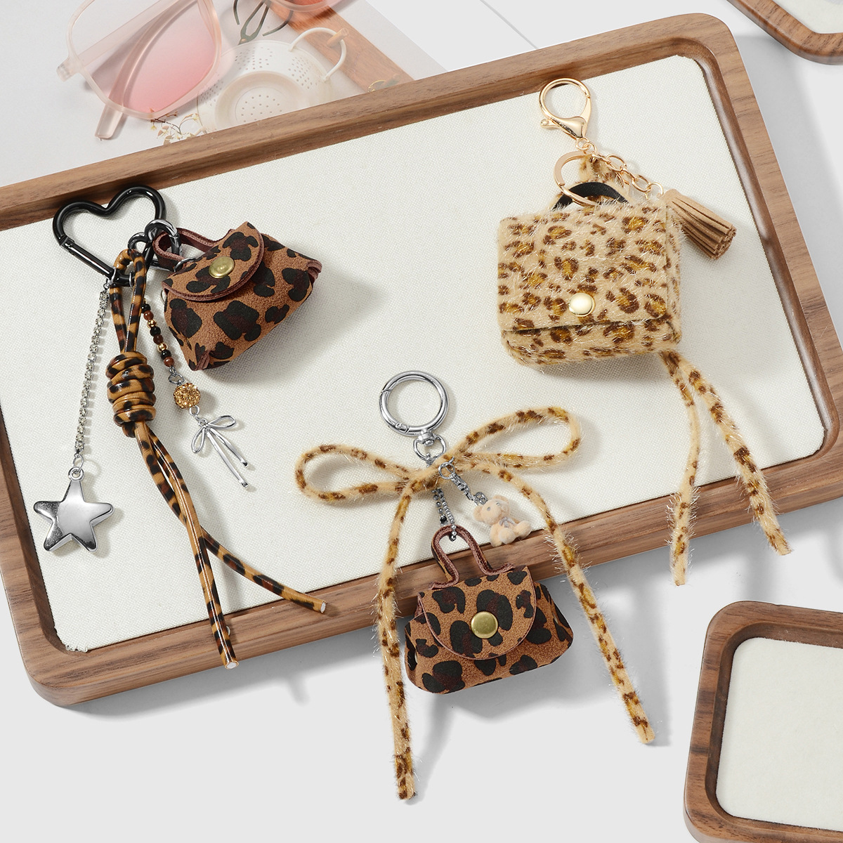 新款ins复古甜酷时尚棕色豹纹蝴蝶结小包零钱包星星DIY钥匙扣挂件
