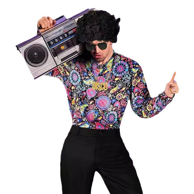 男士70年代迪斯科服装复古花卉衬衫喇叭裤两件套舞台表演服套装