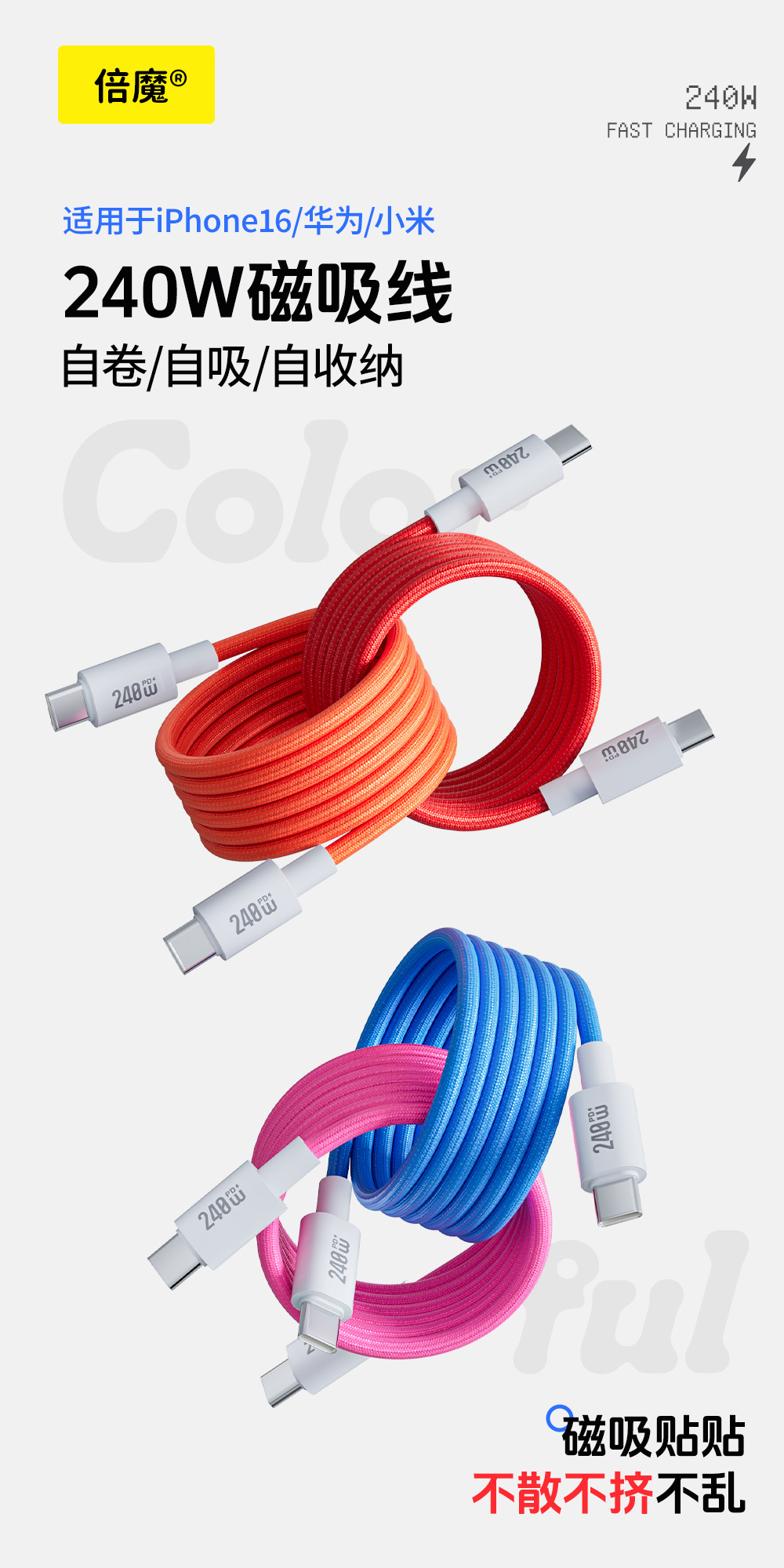 【实力工厂】倍魔多彩磁吸收纳数据线适用于苹果华为安卓超级快充