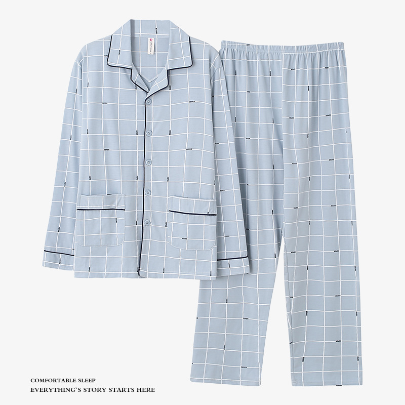 純綿パジャマ男性春秋長袖セット綿の薄い格子の大きいサイズは家庭服男性を着ることができる