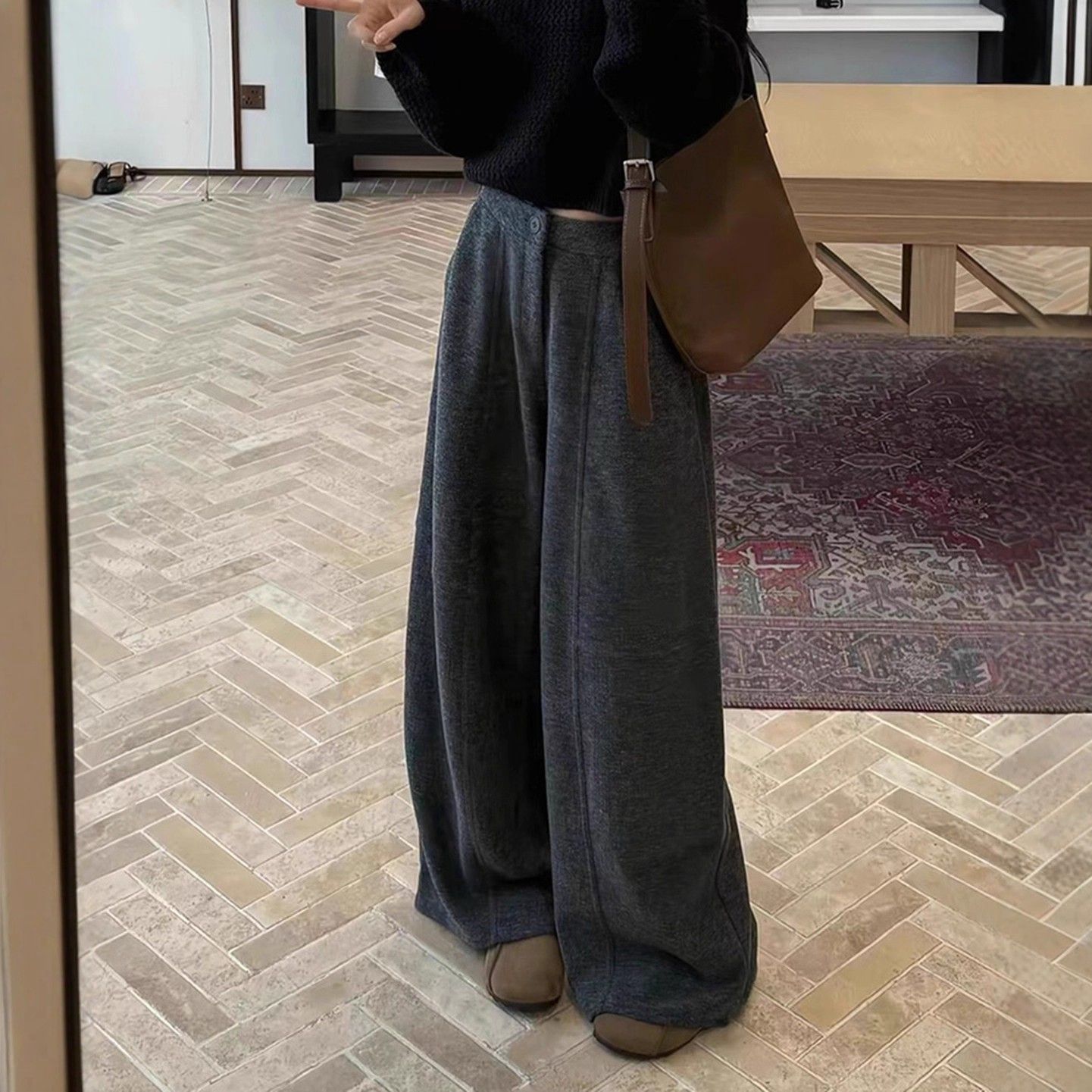 秋冬新款韩版大码宽松毛呢休闲裤梨形身材显瘦简约风纯色阔腿裤