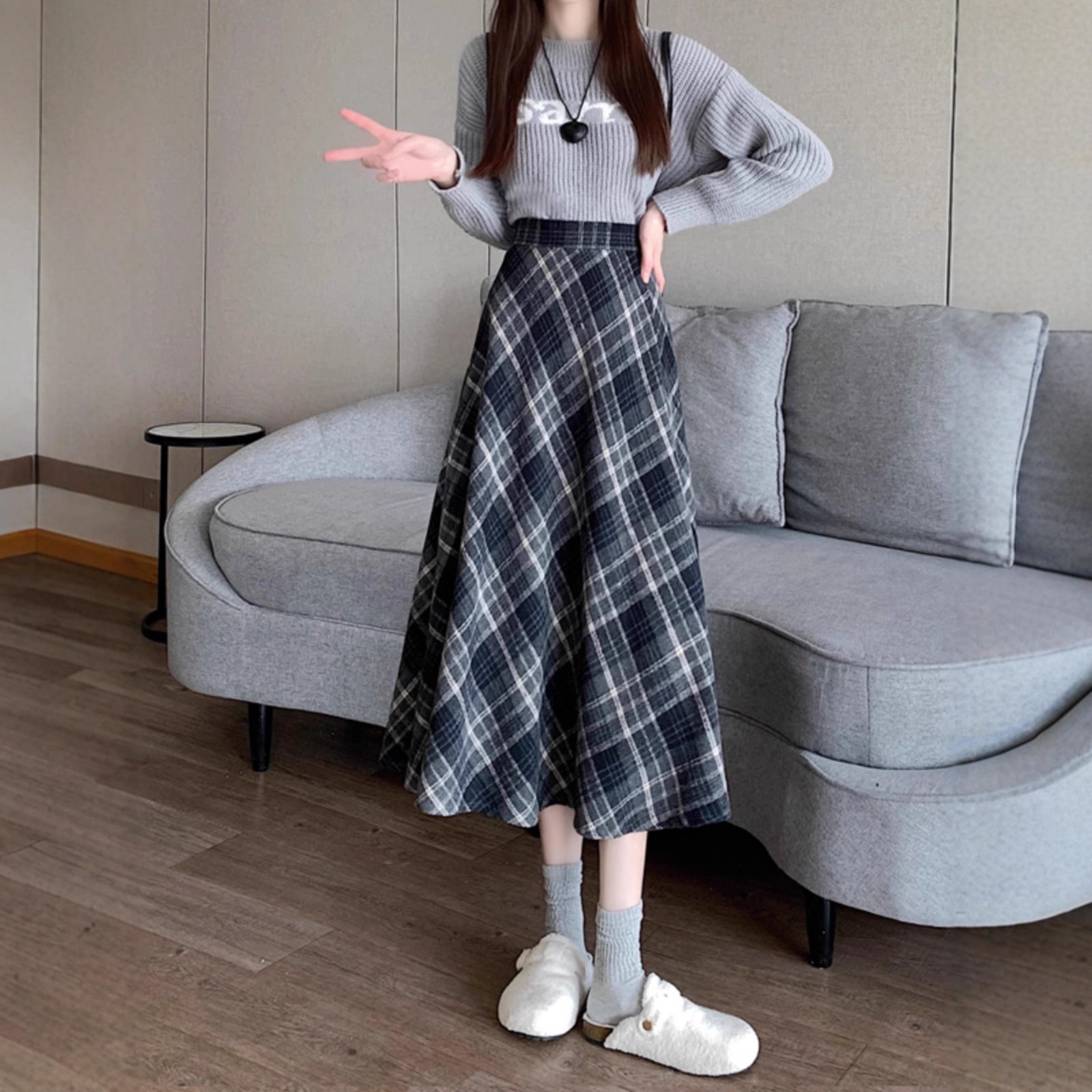 美ラードの高い腰の毛の半身のスカートの女性の冬の韓国版の新型の格子は傘のスカートの中の長いa字のスカートを合わせます。