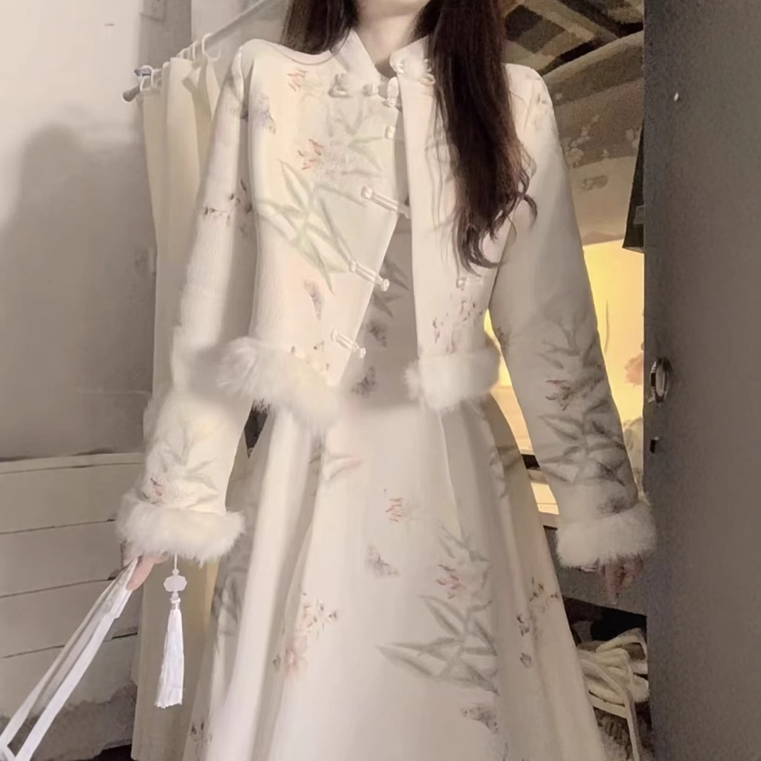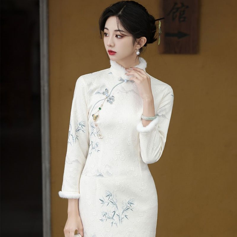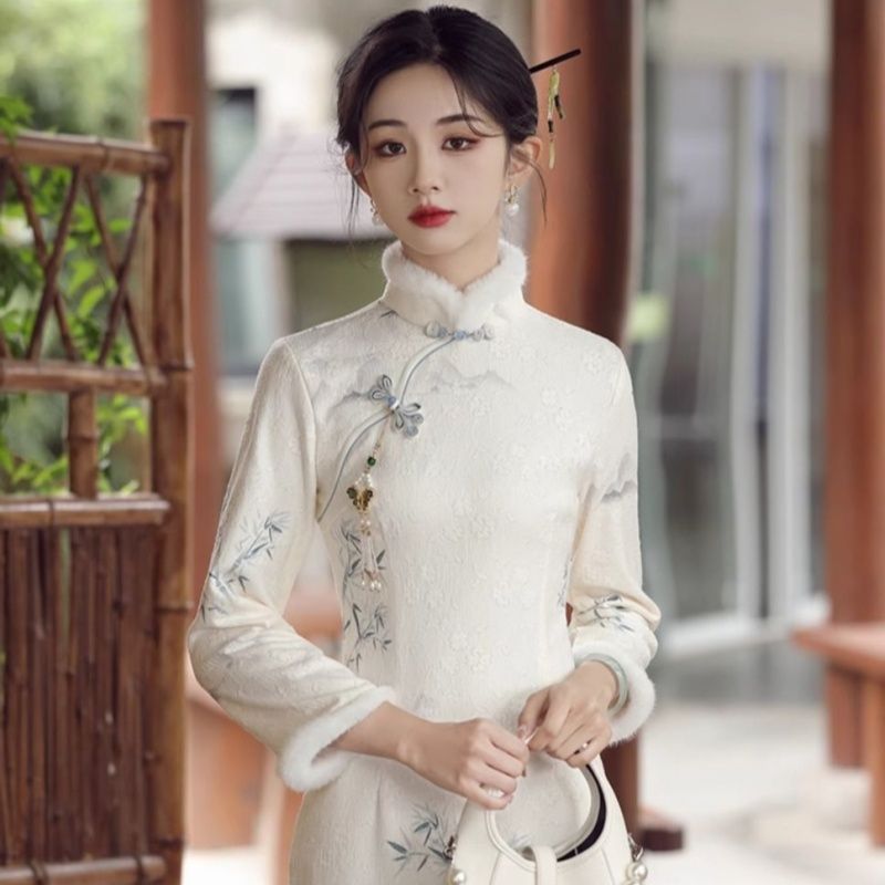 2025年冬季新款改良旗袍绣花麂皮绒加绒淑毛领女范新中式