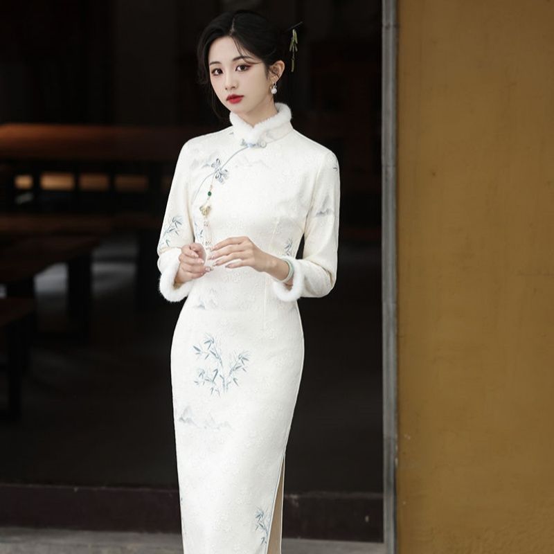 女人味毛毛领旗袍连衣裙女新款秋冬高级感复古修身包臀鱼尾长裙子