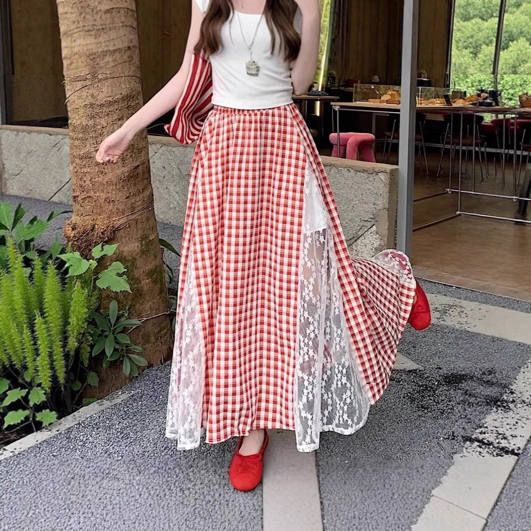 韓国の甘いレースステッチ赤いチェック柄スカート 2025 春夏新作カレッジスタイル A ラインロングスカート