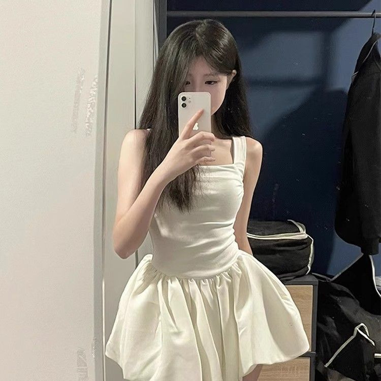 ギャルの白いストラップのワンピースの女性の夏の気質の高級なセクシーなウエストはやせている王女の蓬蓬のスカートの小さいです。
