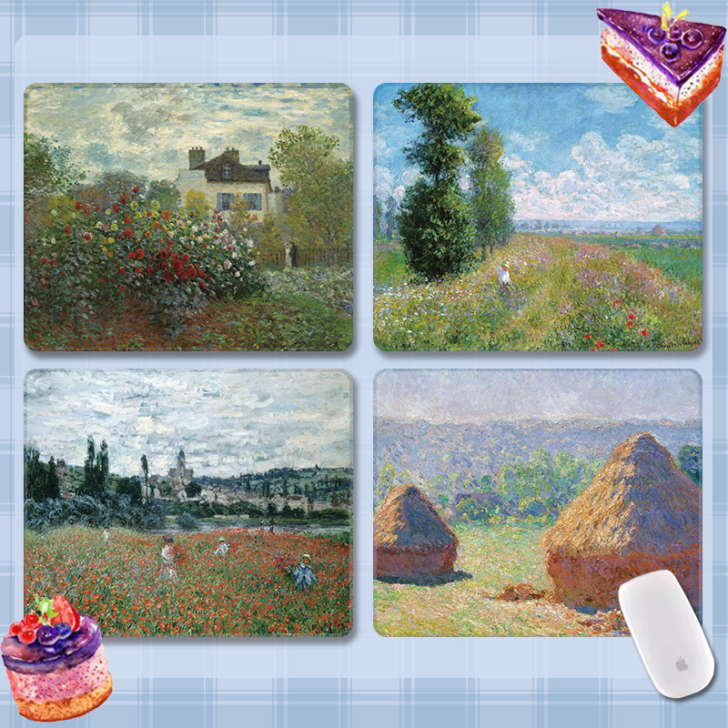 モネ油絵小型マウスパッド、美しいアートスタイル、携帯用、厚手、オフィスデスクパッド、キーボードパッド、縁取り加工
