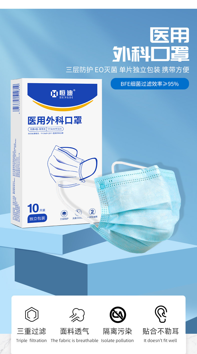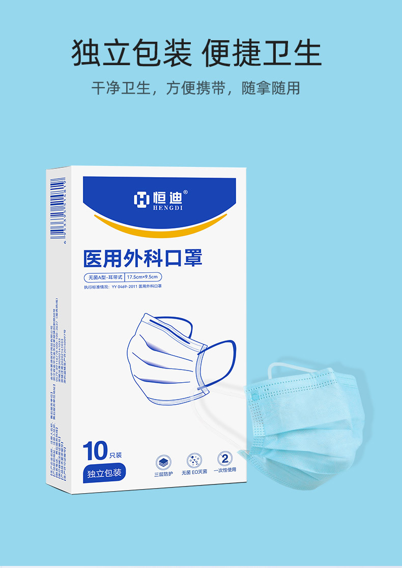 恒迪使い捨て医療用外科マスク独立包装三層防護医療用級袋工場卸売りスポット