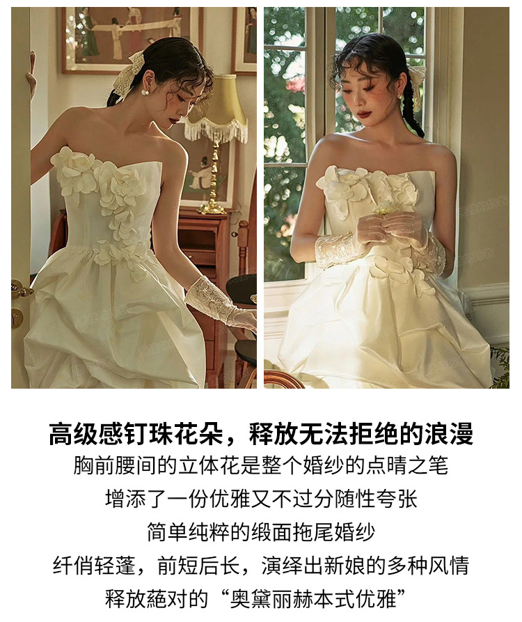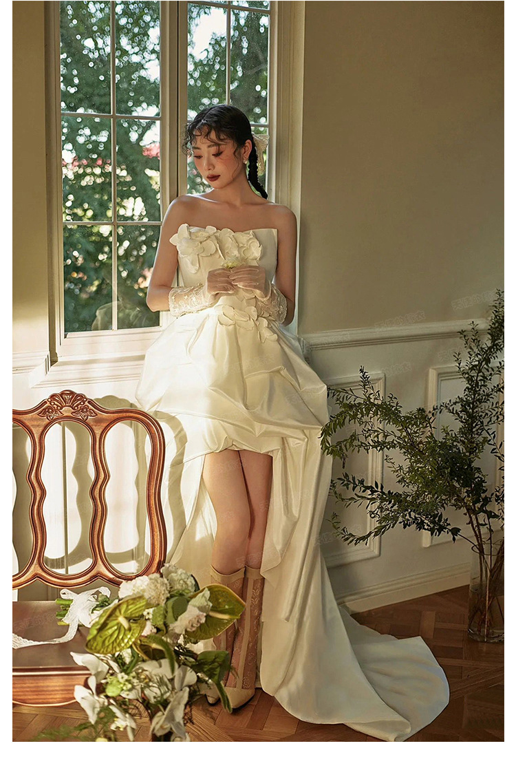 仙気漂う甘い花びらのチューブトップ韓国風ブライダルサテンウェディングドレス2025冬新作旅行撮影用おしゃれな軽ウェディングドレス