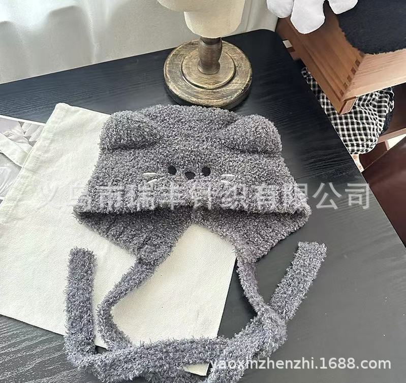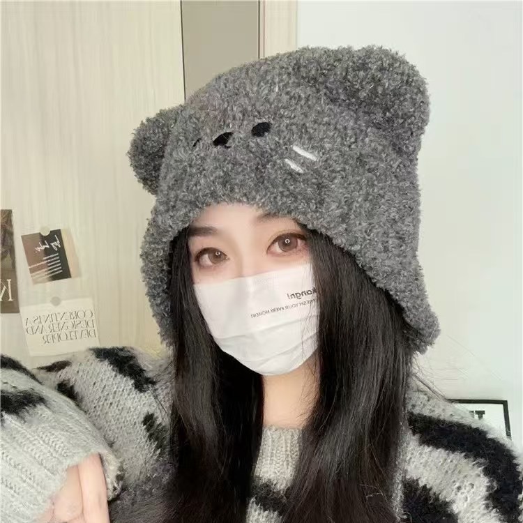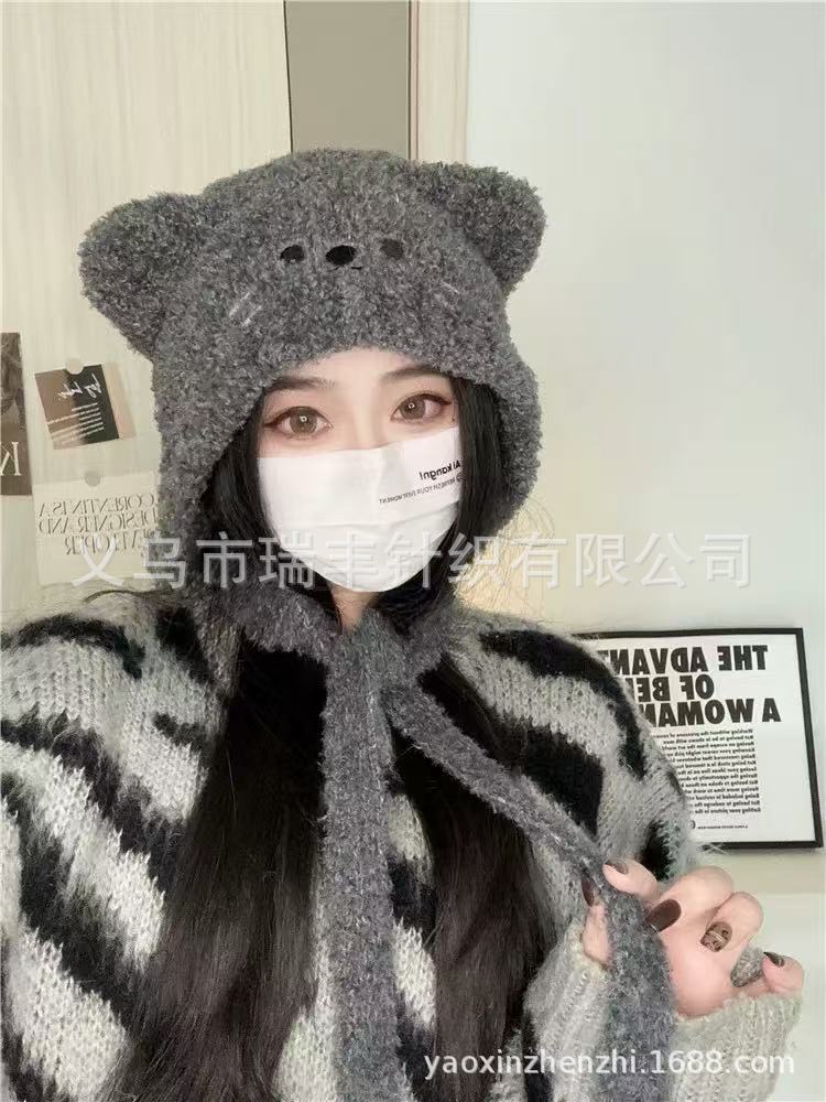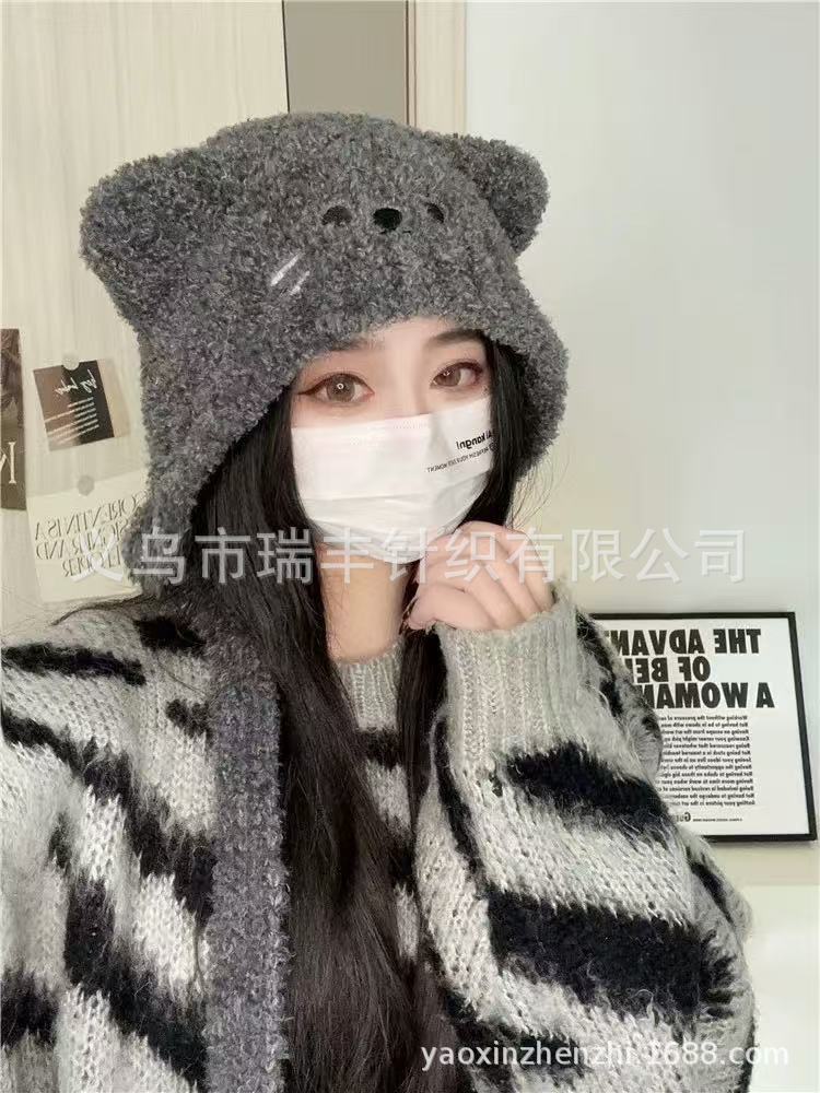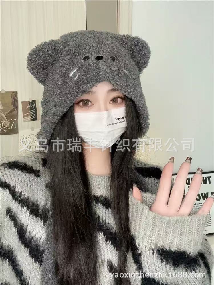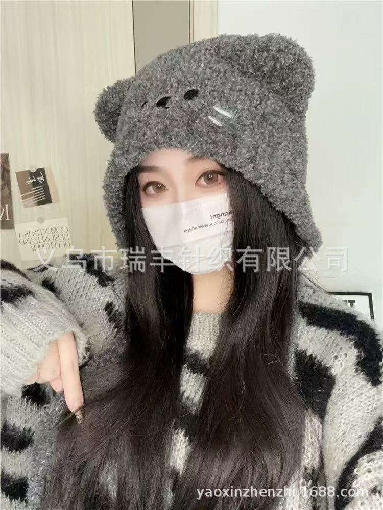 小熊耳朵毛线帽女冬季可爱加绒加厚针织帽大头围显脸小保暖包头帽
