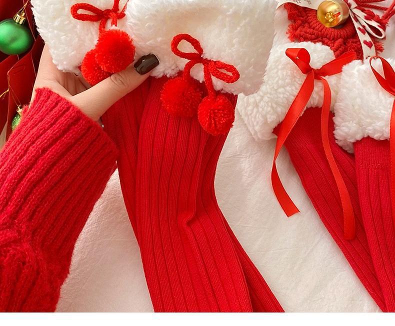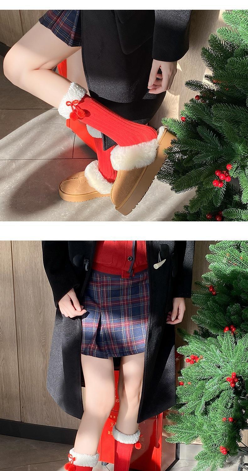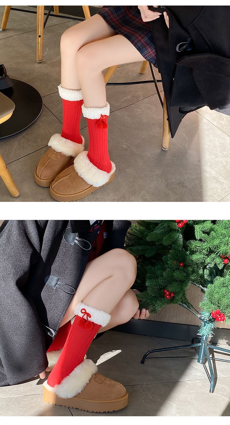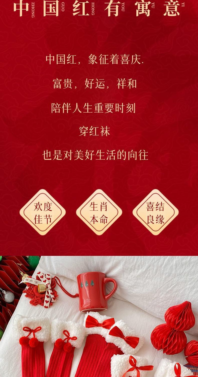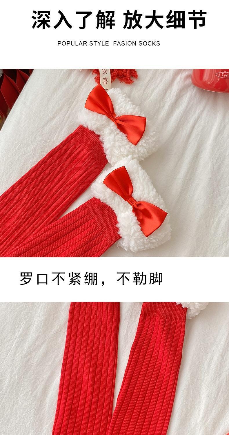 本命年袜子女秋冬新年毛绒袜花边蝴蝶结中筒洛丽塔大红中筒袜