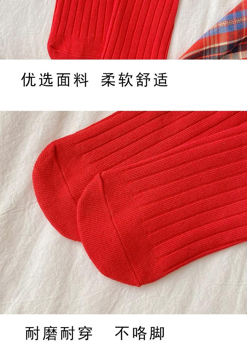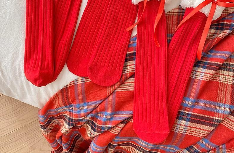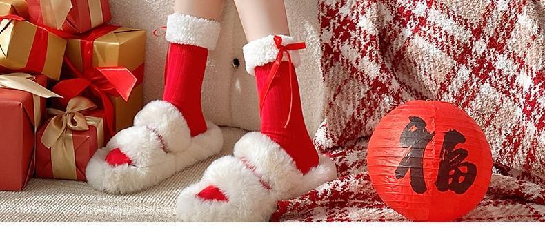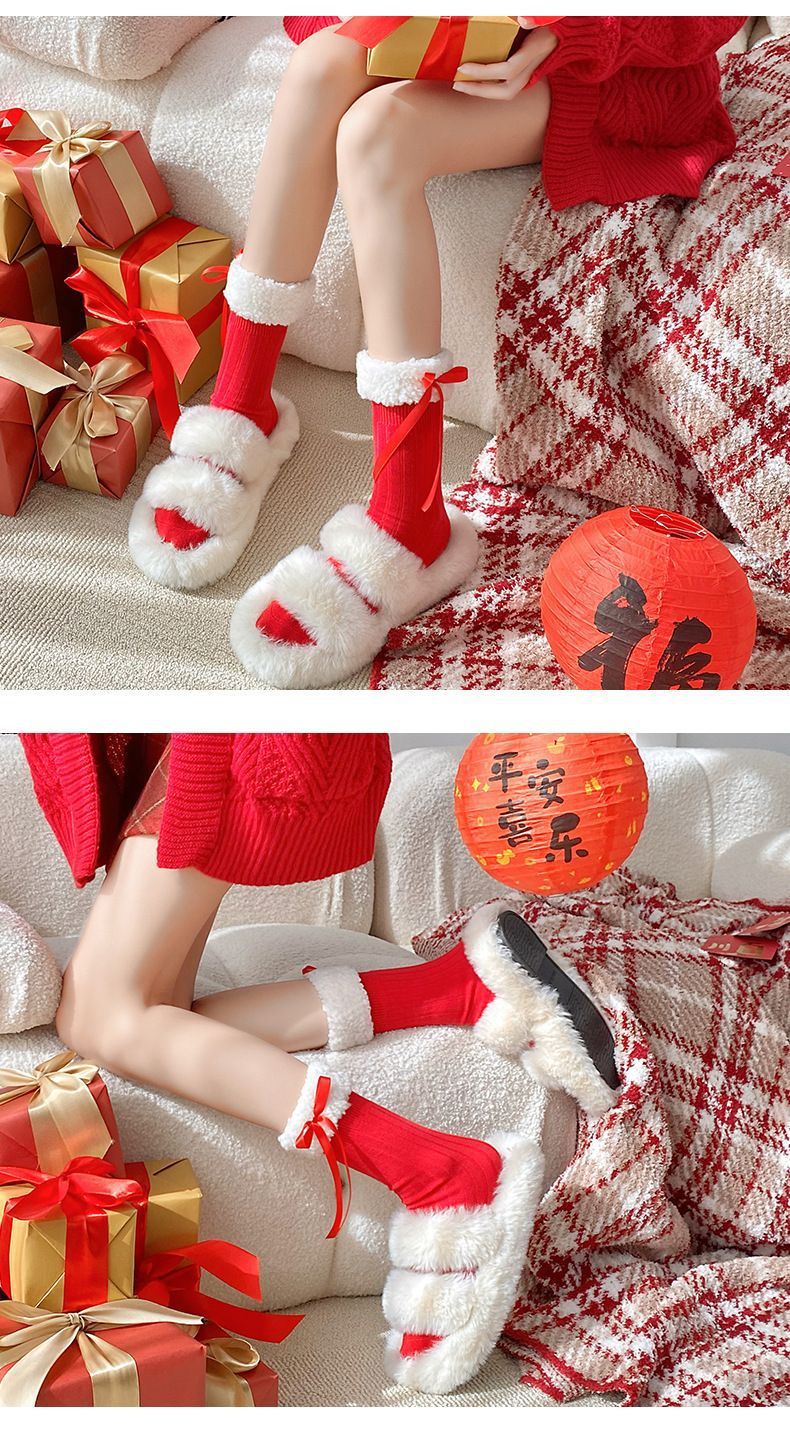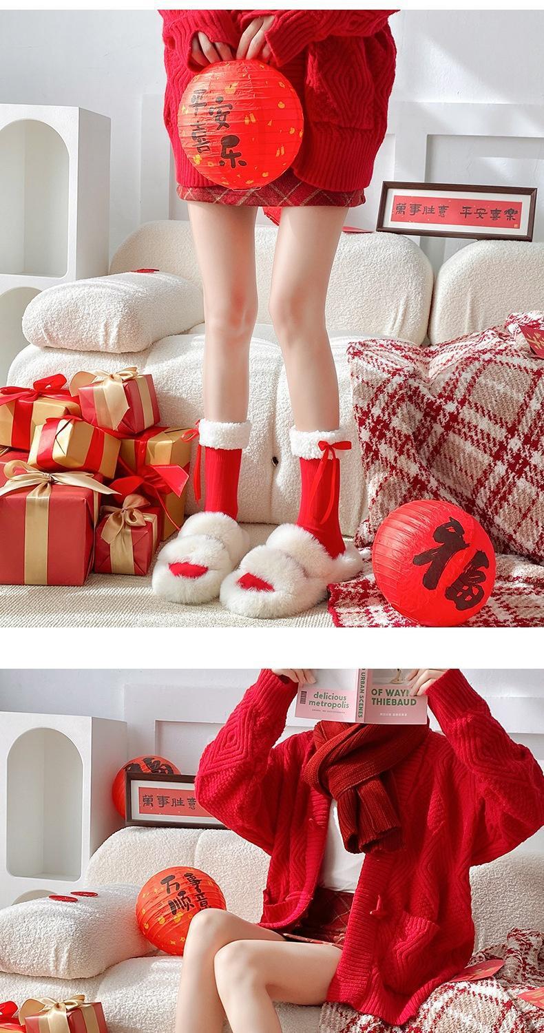 本命年靴下女子秋冬新年パイル靴下レース蝶結び中筒ロリータ大紅中筒靴下