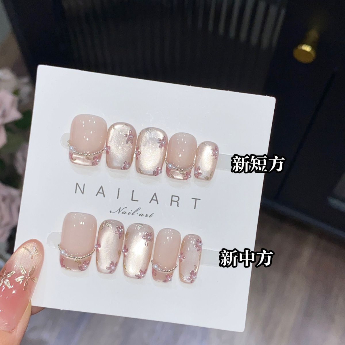 Aomian Blossoms 手作りウェアラブルネイル、手描きの手刺繍花びら、キャットアイガラスビーズマニキュアとアーマー