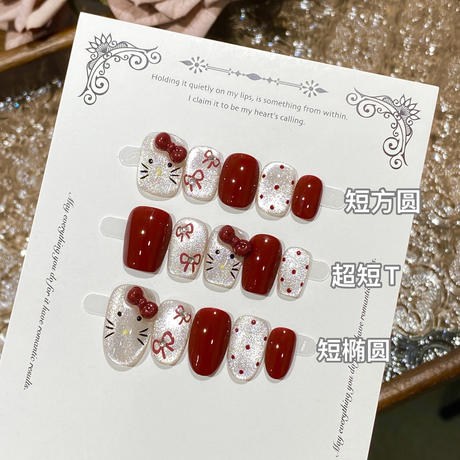 奥勉純手作りKitty猫が甲酒赤色の新年ネイルを着ています。