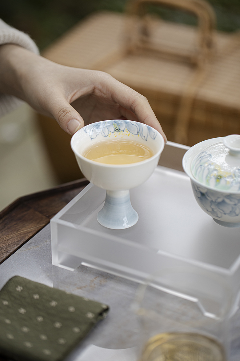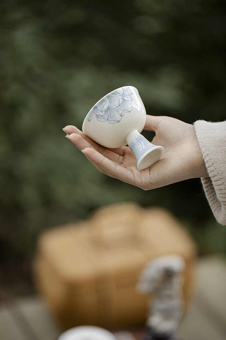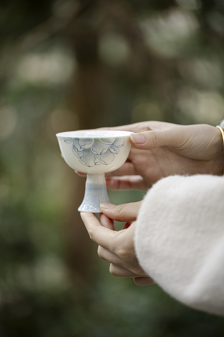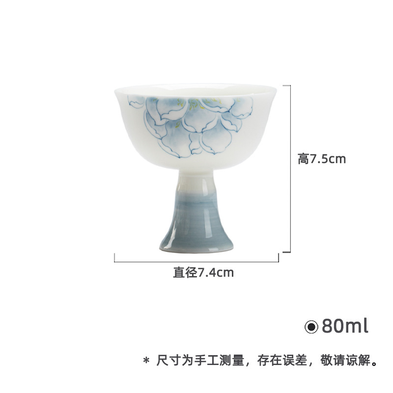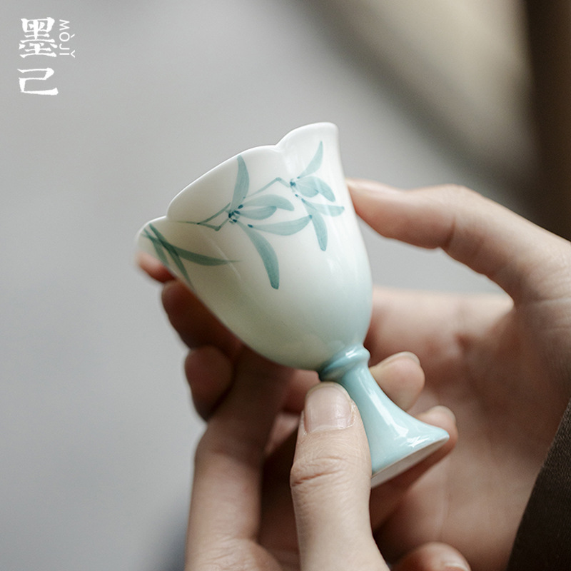 墨己玉泥手描き蘭グラデーション青工夫茶具は宋花口高足茶杯家庭品茗杯単杯に似せている