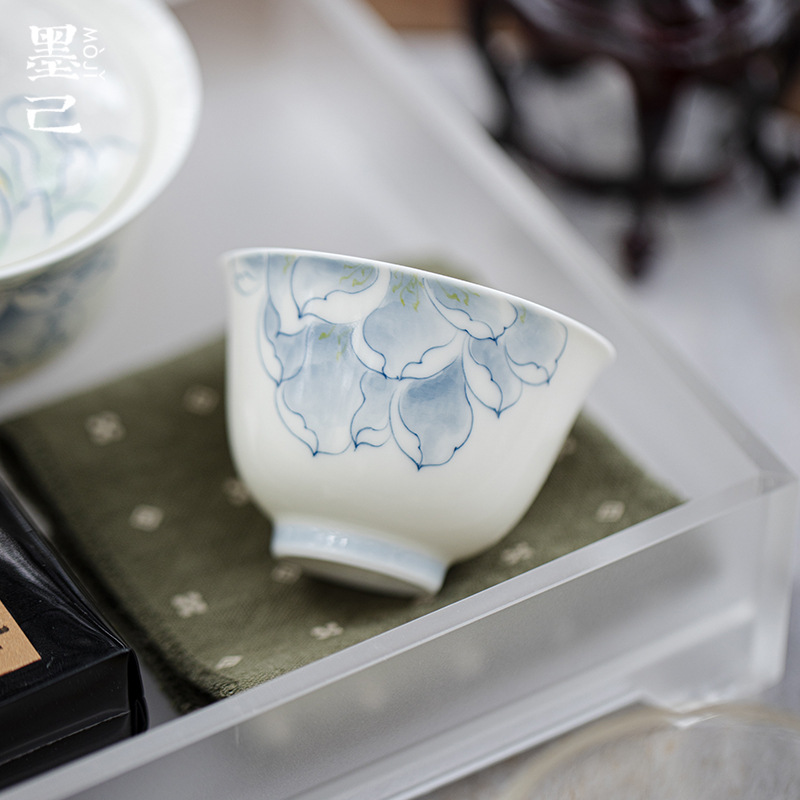 墨己手描き青花蓮品茗杯工夫茶器家庭用陶磁器小容量単杯玉泥茶コップ