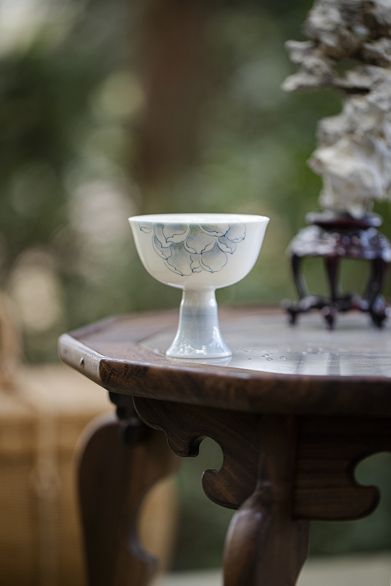 墨己手描き青花蓮は宋高足品茗杯カンフー茶器家庭用主人杯陶磁器高足茶杯に似せています。