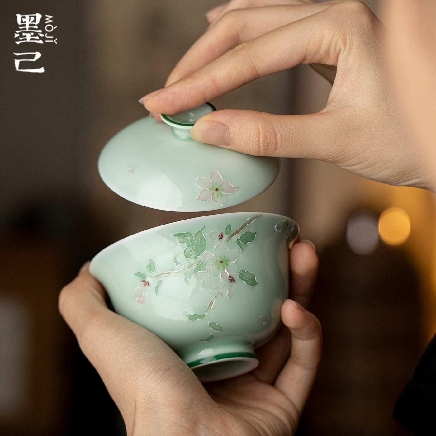 墨己手绘釉下彩梨花陶瓷盖碗家用薄胎仿烫泡茶碗功夫茶具岩茶盖碗
