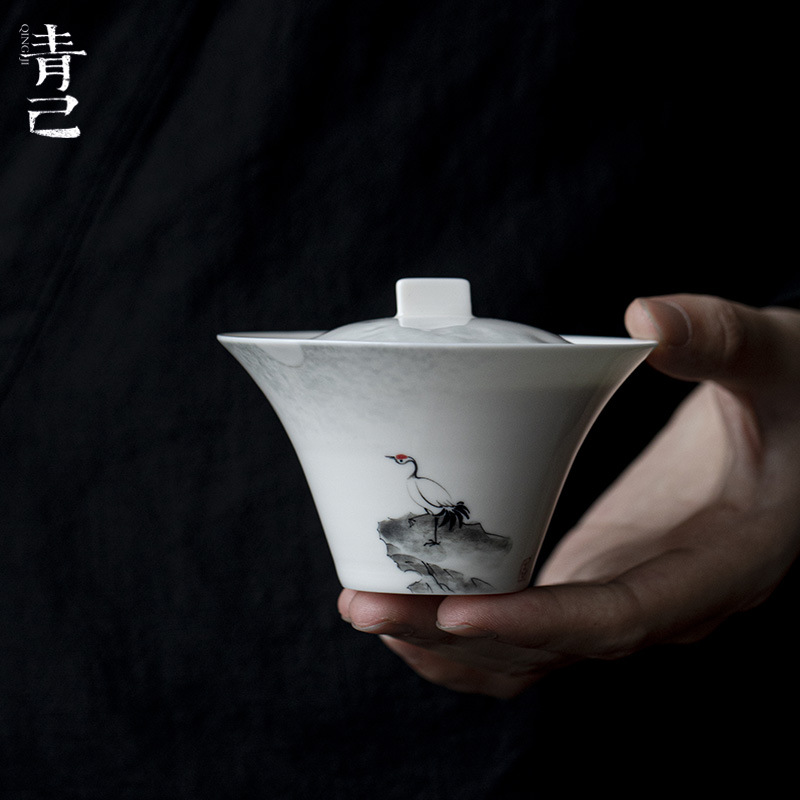 青己の水墨の手描きのツルの蓋の工夫の茶器の陶磁器の家庭用のお茶の碗の文人の薄い胎の手は蓋の碗を作ります。