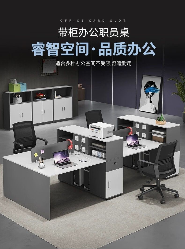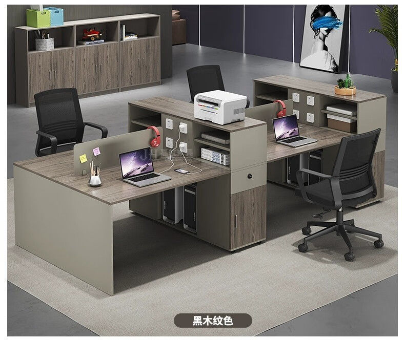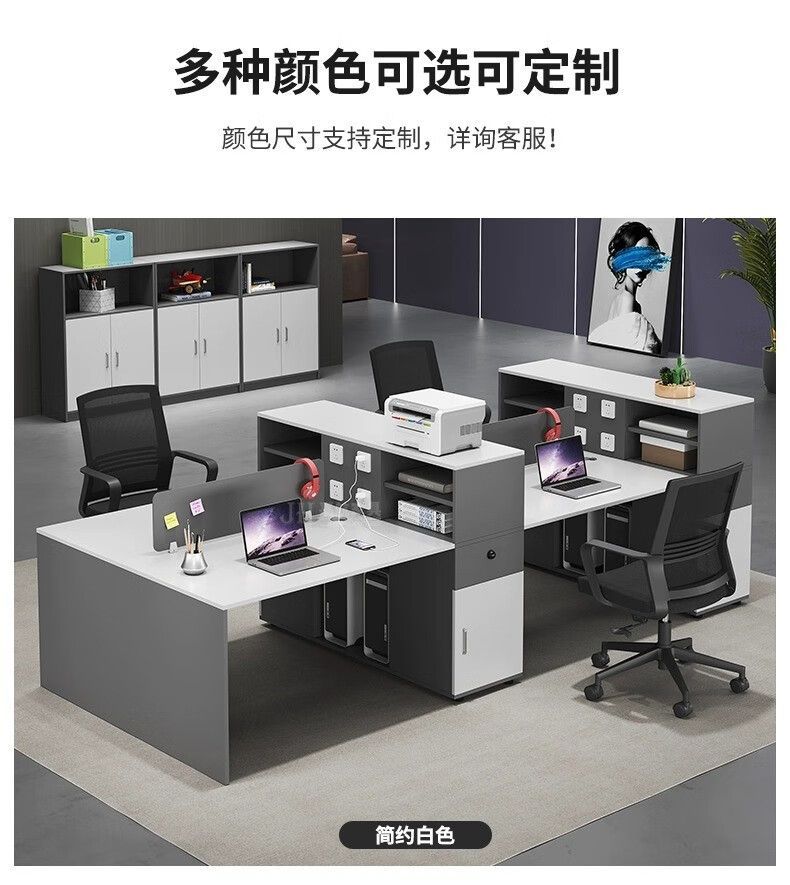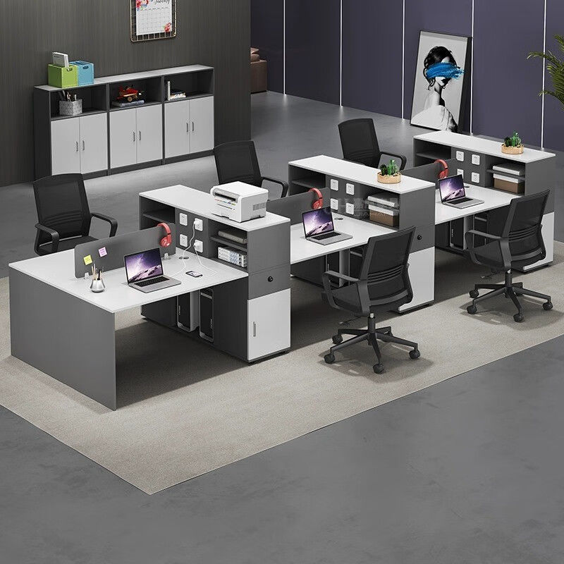 事務机職員のテーブルと椅子の組み合わせは4足6人でシンプルで現代的なオフィス従業員の財務コンピュータカードのステーションである