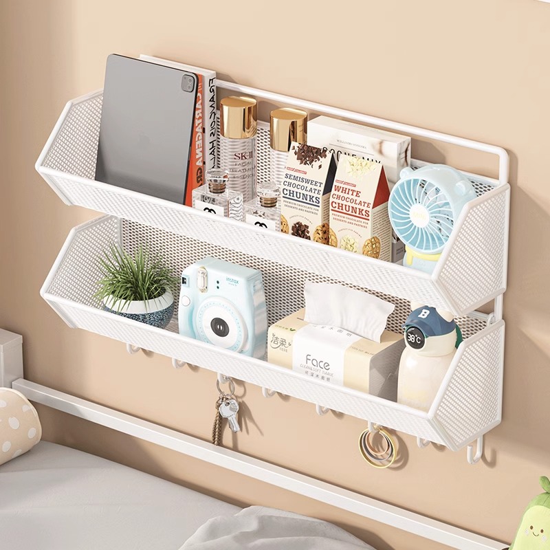 事務机の物置棚のデスクトップにバスケットを掛けて吊り式のステーションを整理します。