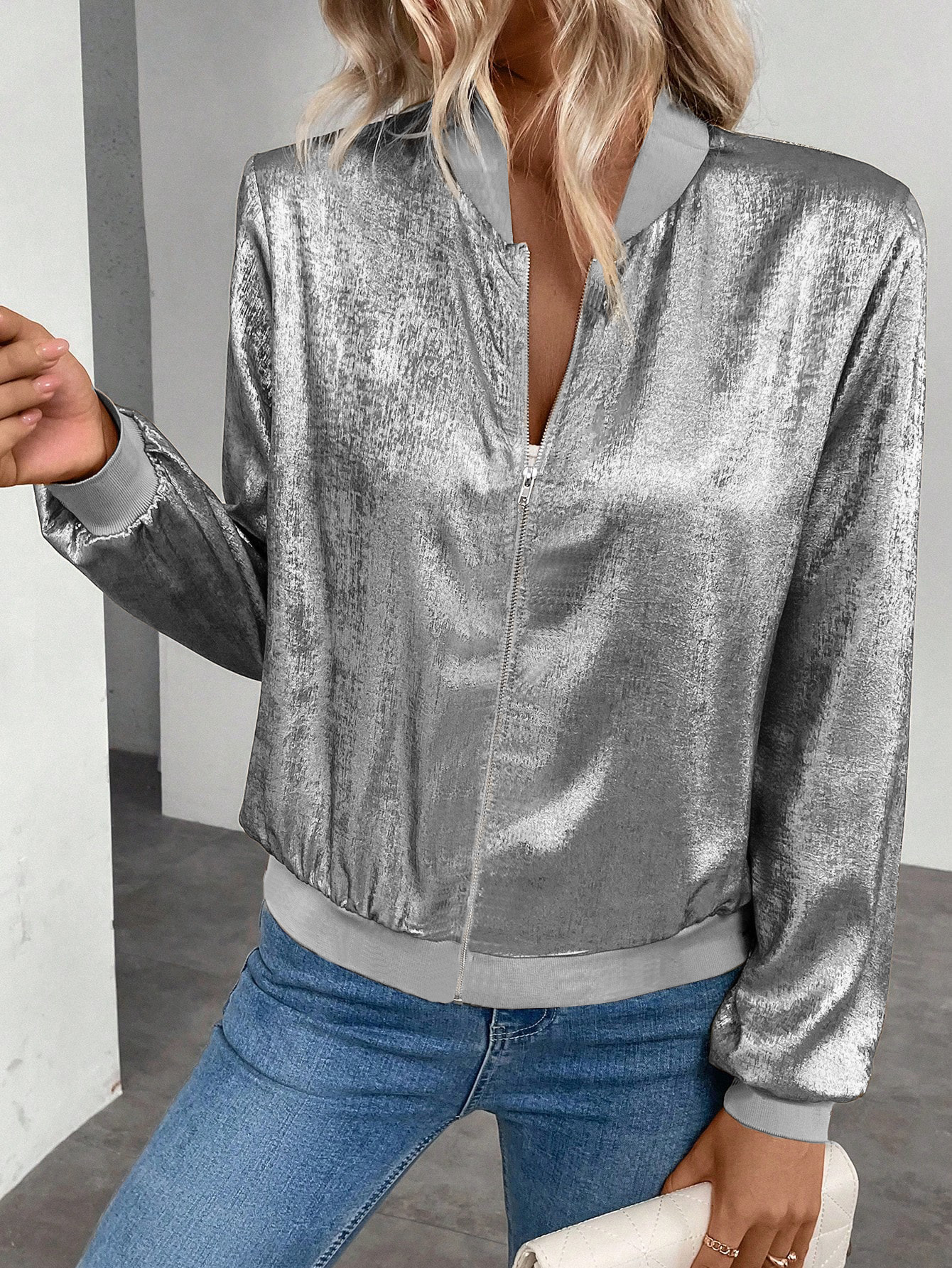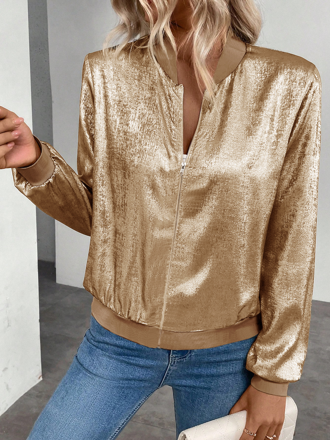 欧米のクロスボーダーアマゾン2025タイプの女性式春秋長袖ファスナー金箔タイプのカジュアルジャケット