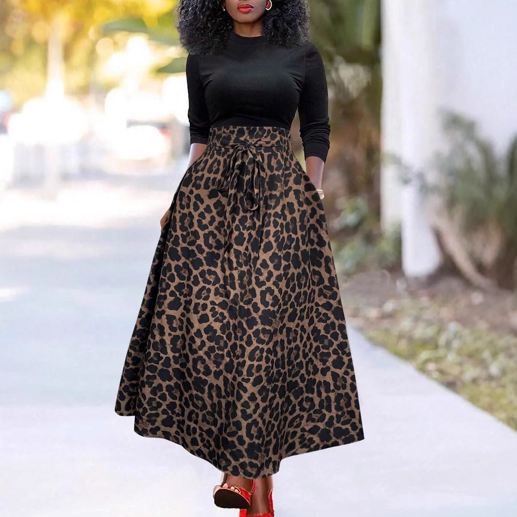 秋冬の新作ファッション、シンプルなリボン付きヒョウ柄ロングスカート、エレガントで多用途なパーティーウエストシェイプミドル丈スカート