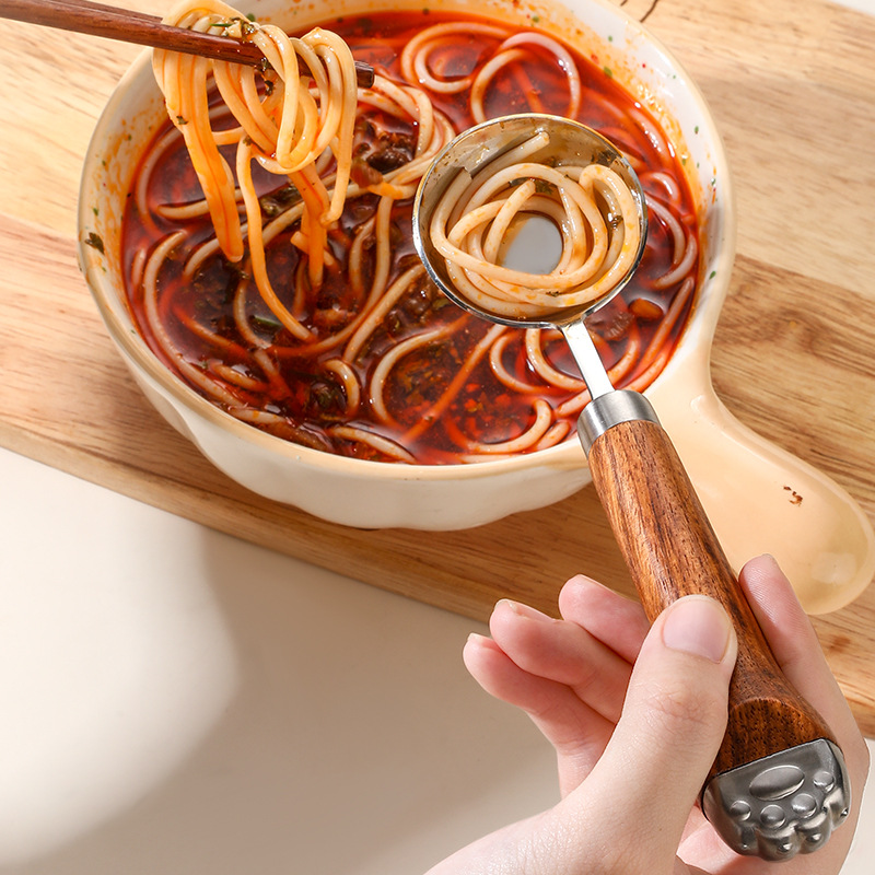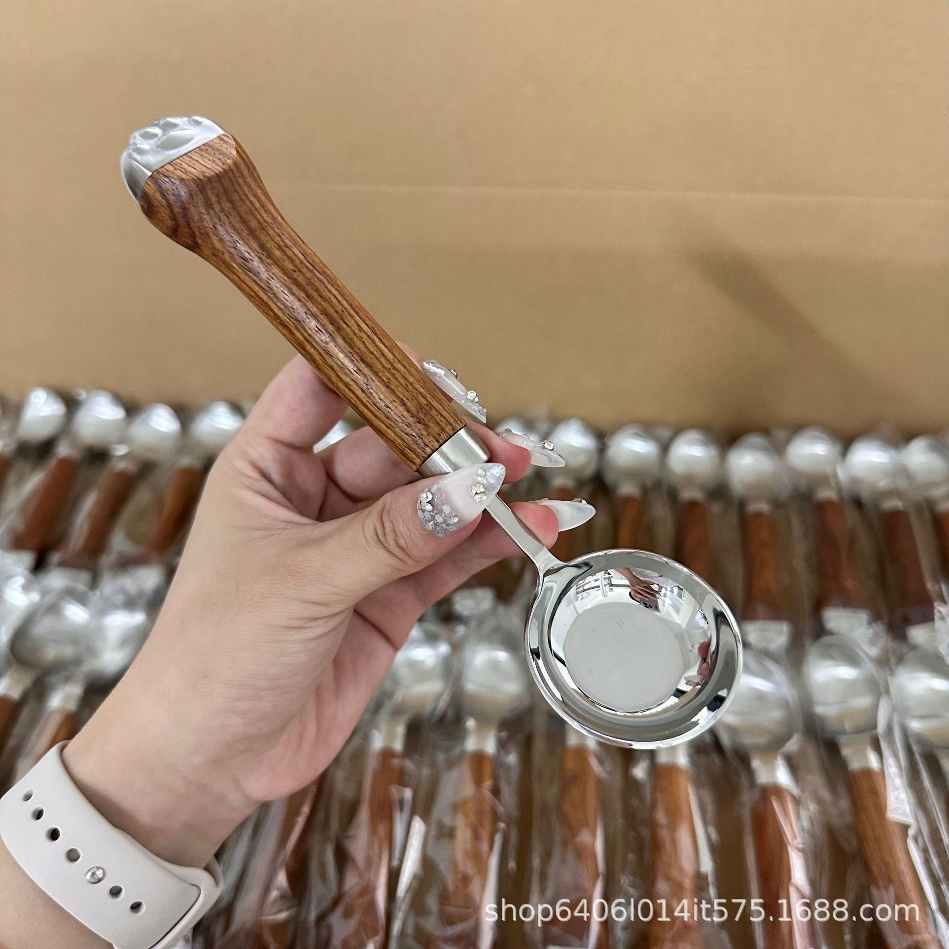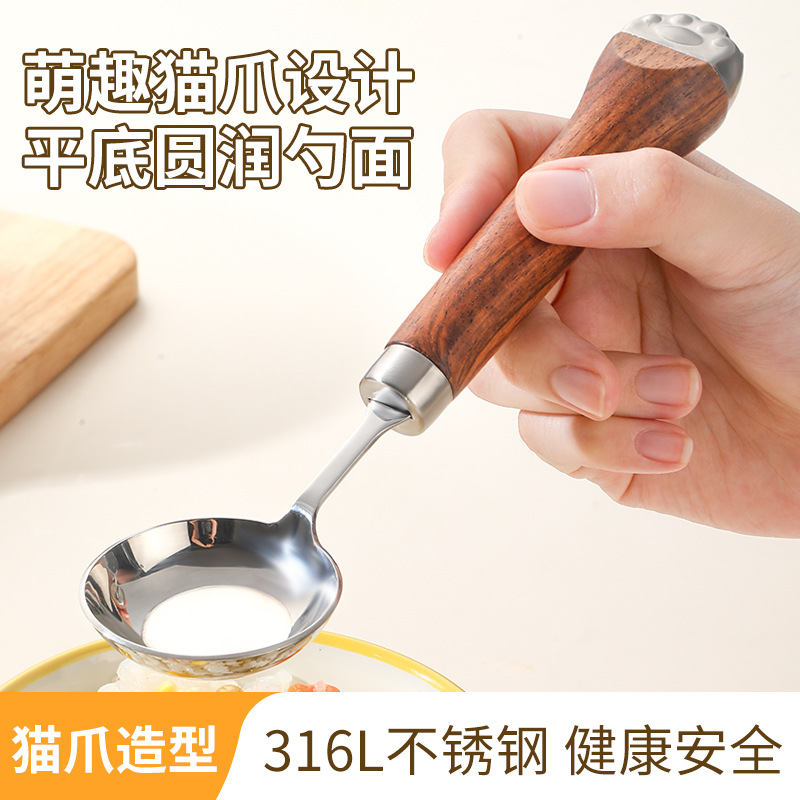 316L不锈钢勺子猫爪木柄平底圆勺嗦粉家用吃饭汤勺螺蛳粉汤匙调羹