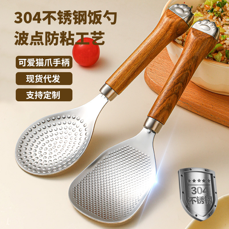 304不锈钢饭勺花梨木猫爪手柄饭匙家用盛饭公勺厨房防烫分餐勺子
