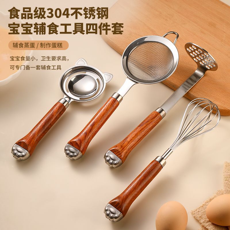 304不锈钢压泥器漏勺婴儿花梨木柄宝宝辅食工具过滤网筛蛋清分离