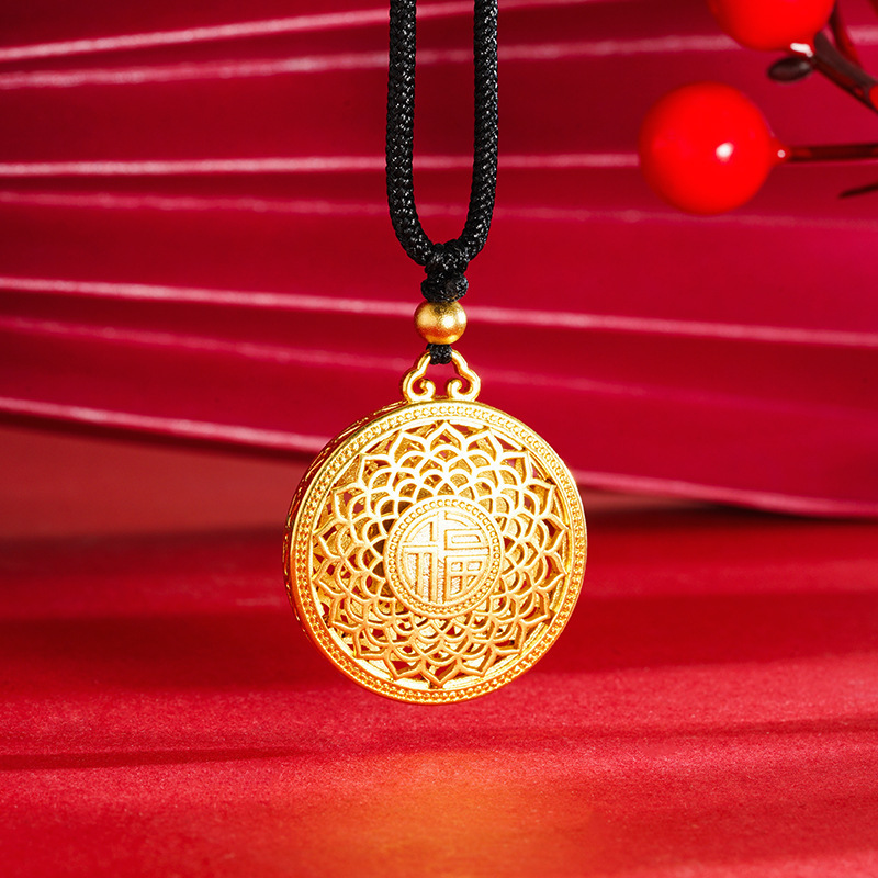 模造金八宝蓮花コンパスペンダントネックレス銅金メッキ円盤ペンダントセーターチェーン透かし彫り福字ネックレス卸売り