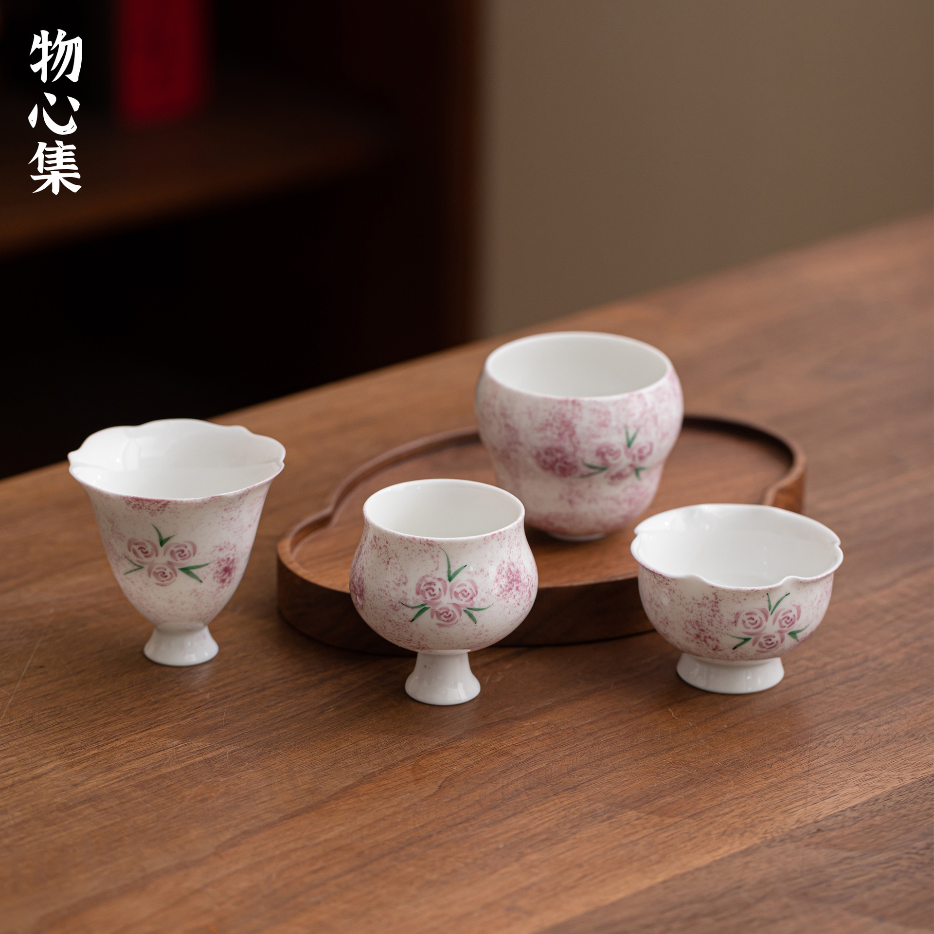 物心集手描き紫薔薇陶磁器主人杯高足花口品茗杯工夫茶器女性用シングルカップ
