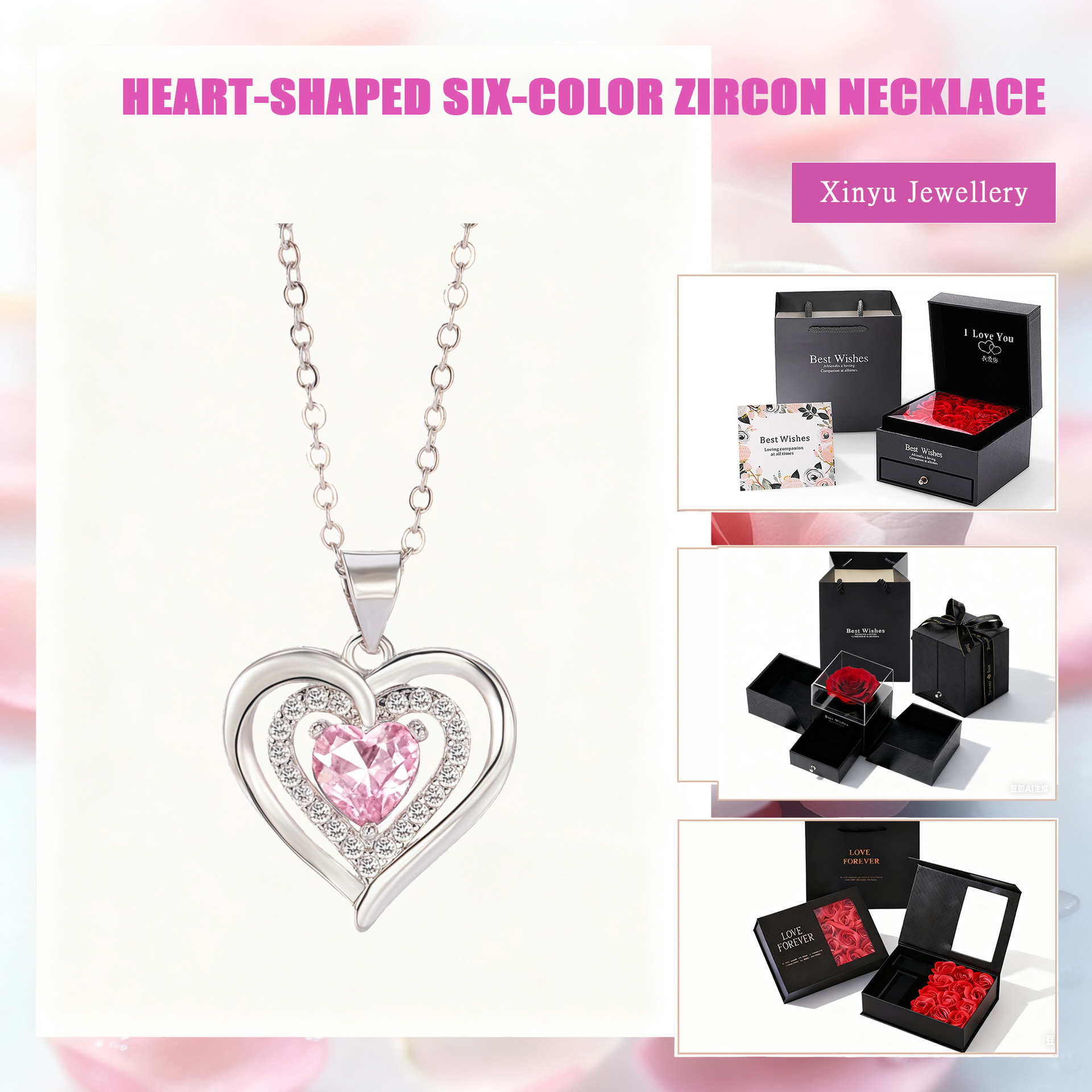 亚马逊爱心项链女式欧美时尚镶钻六色吊坠严选配饰锁骨链跨境批发